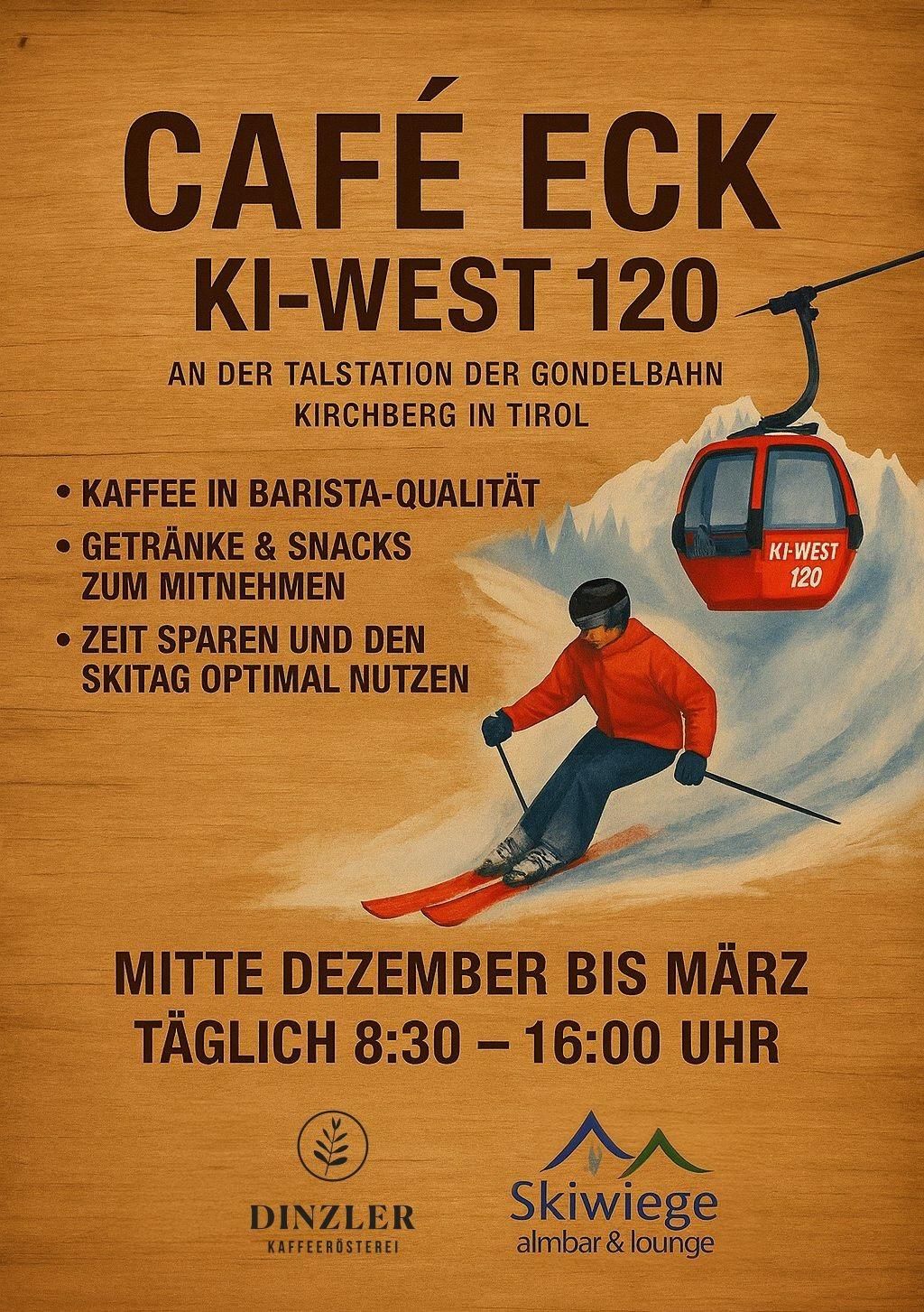 Café Eck KI-West 120 – right at the valley station of the Kirchberg gondola in Tirol! Start your ski day perfectly with barista-quality coffee, refreshing drinks, and delicious snacks to take away.Quick, convenient, and full of flavor – save time and make the most of your day on the slopes. Open from mid-December to March – daily from 8:30 a.m. to 4:00 p.m.