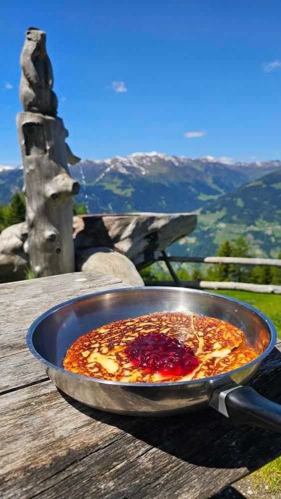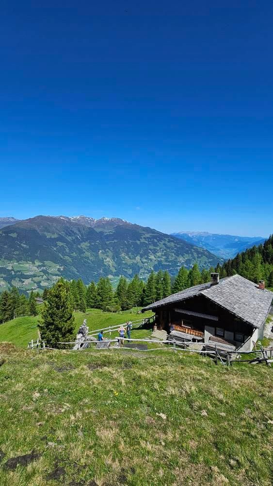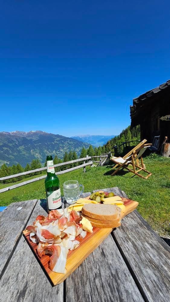 Excellent views of the Zillertal front and rear. Next to the romantic hut and the old stable, a new stable with a modern cheese dairy was built in 1996. The milk is processed into mountain cheese, Tilsiter and grey cheese. Speciality of the snack station: Melkermuas with Granten (cranberries).