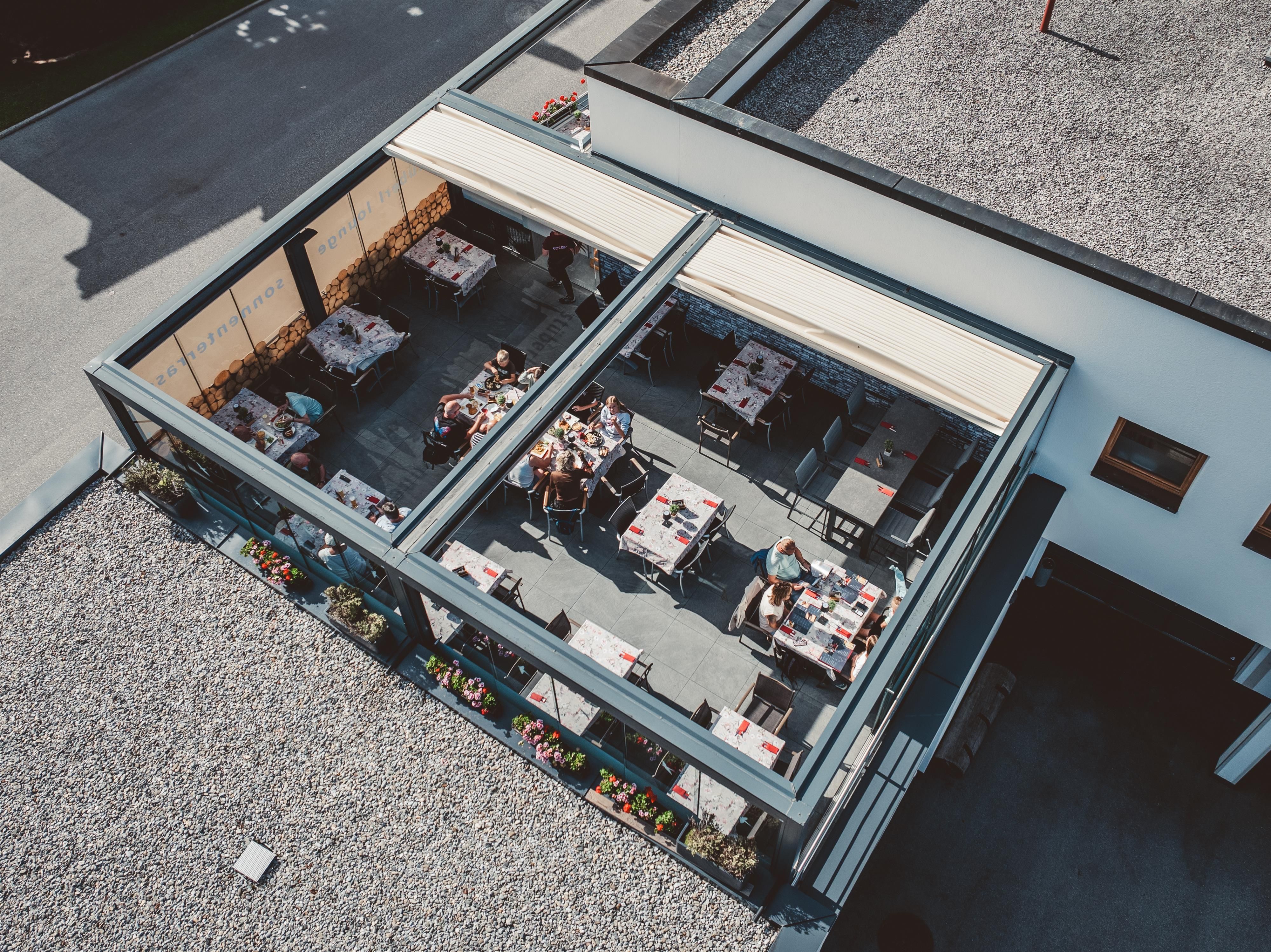 The large covered sun terrace is open in all weathers.