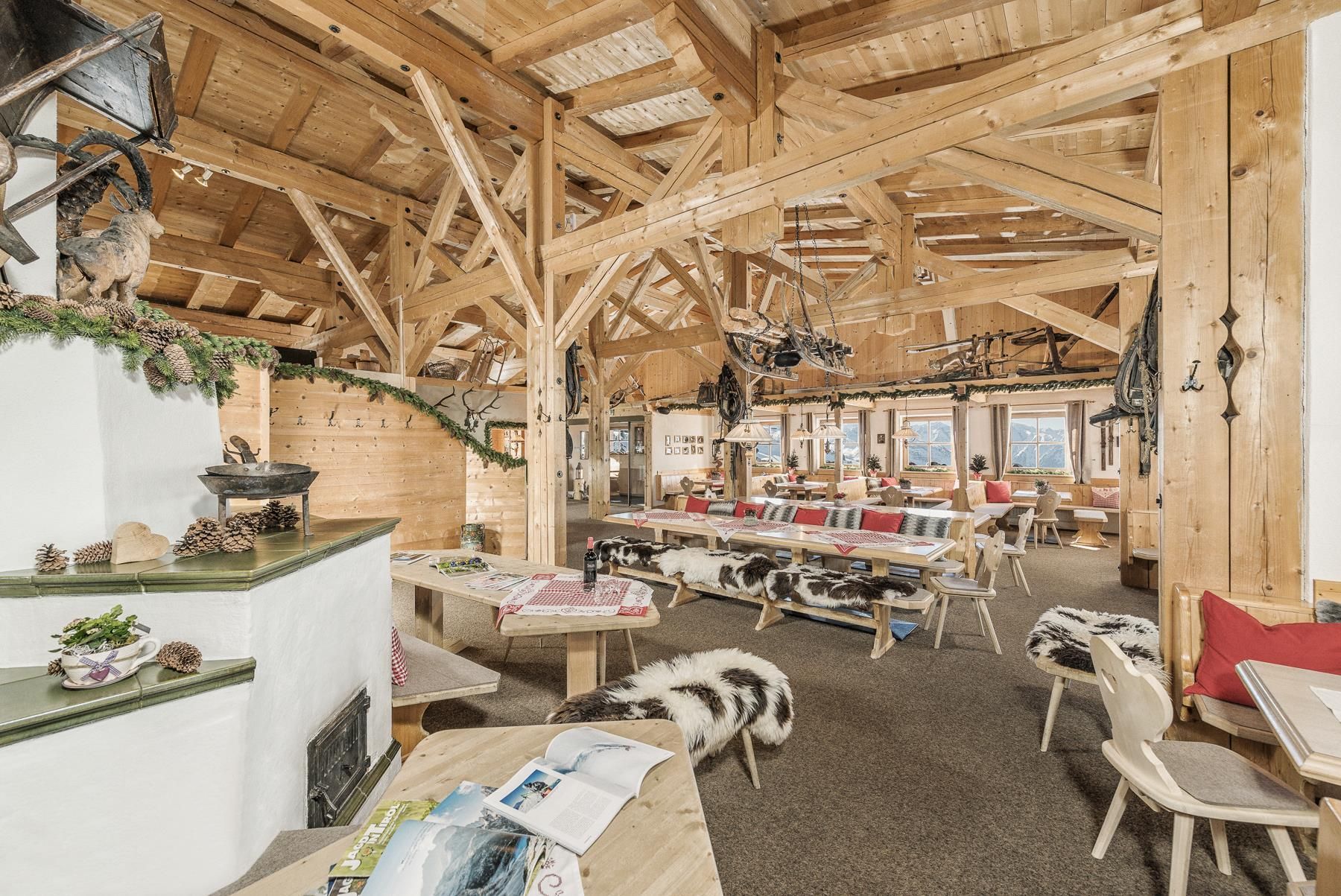 The Kreuzjoch Alm in Zell am Ziller in the Zillertal Arena is a popular meeting point for winter sports enthusiasts! You can expect a breathtaking panoramic view over the Tux-Zillertal Alps all the way to the Karwendel and Rofan Mountains. Enjoy the cozy cabin atmosphere by the warming tiled stove and in the comfortable lounges or relax in a deck chair on our spacious sun terrace in the winter sun!