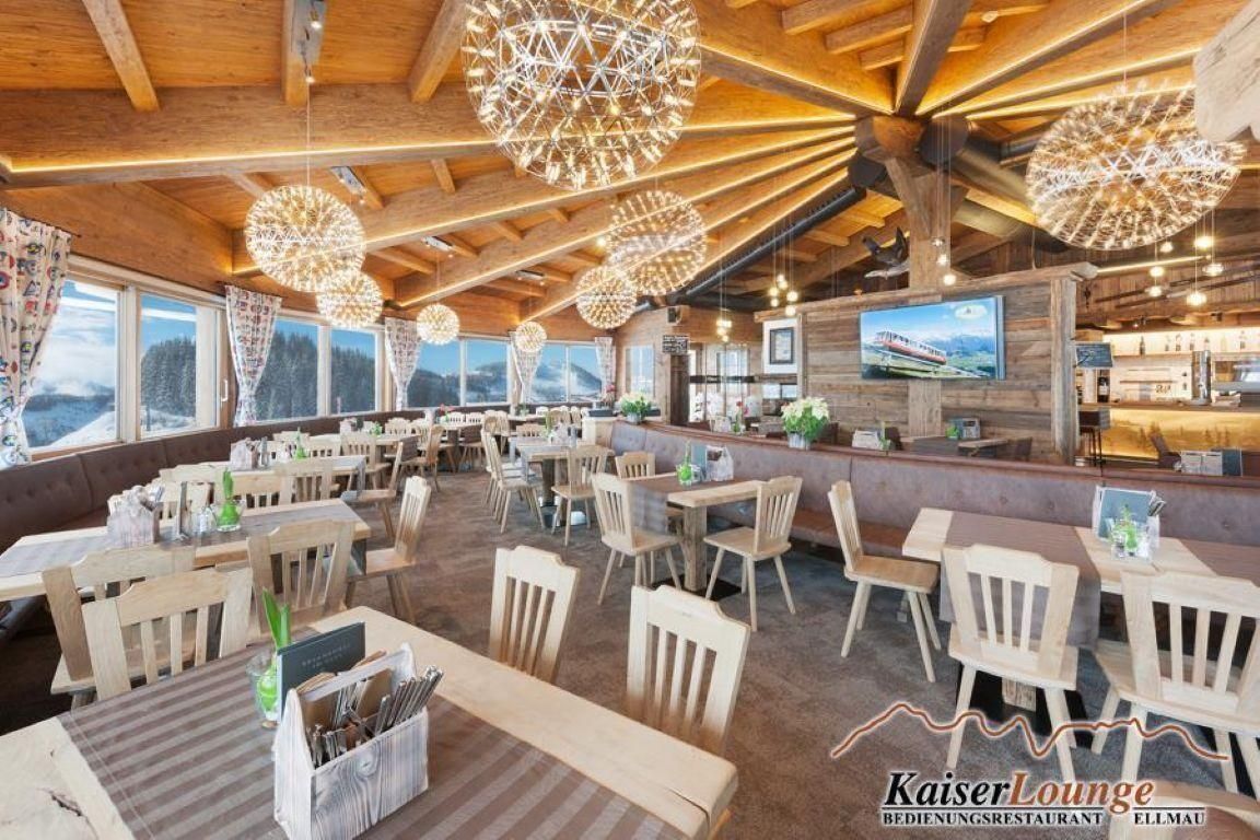 KaiserLounge in Ellmau: Enjoyment with a view in the midst of the Ski World. Breakfast Thu–Sun 9:30–11:00 AM, Lunch menu Thu–Sun 11:30 AM–4:00 PM (Fri until 2:00 PM). Modern Tyrolean cuisine, drinks, and a large sky terrace with a chill-out area. Online reservation possible.