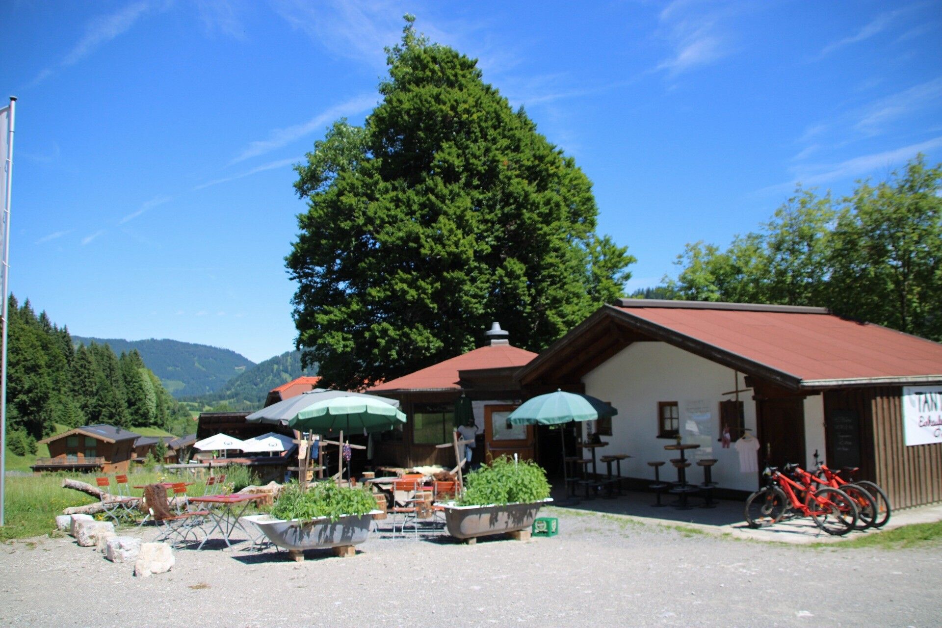 We offer:A sufficient selection of drinks as well as a small menu:GrammelschmalzbrotTafelspitzsulz + breadBratwurst spread + breadHomemade pizzaEgg liqueur cakeCarrot cake We sell:Local products from the Tannheimer Tal (mountain cheese from the Usseralp, various types of hard sausage, homemade dumplings and much more.From Kleiner Tiroler (Dominik Kleiner) - clothing, furs and much more.From the Waldesruh farm- goat yoghurt, goat camenbert and much more.From Heidi Mayr- Self-knitted socks for small and large, knitted slippers for children and much more. In addition, we offer barbecue evenings and beer tastings (Zillertal craft beer) on reservation.E-bike rental for a whole day incl. helmet for 29 €.