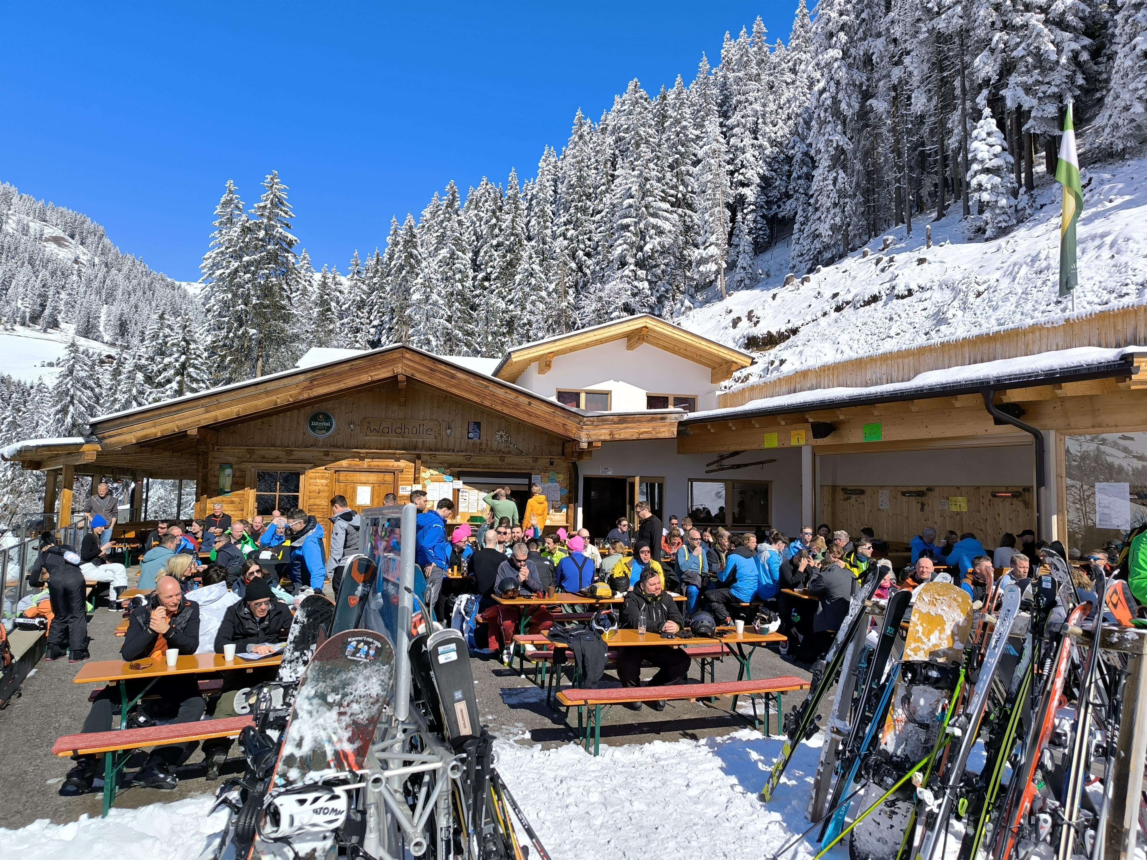 Winterkiosk "Waldhütte" 1.550 mOpening hours:Open todayPlace: Tux : Alpine pasture / hut / mountain restaurant see restaurant detailssee restaurant details: Winterkiosk "Waldhütte" 1.550 m