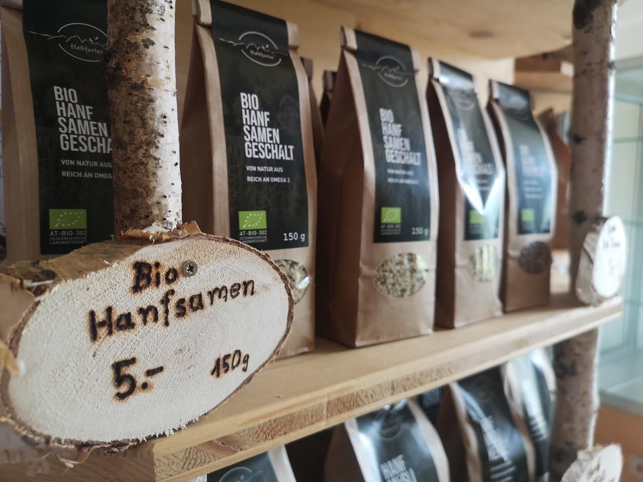 Halbfurter's Hofladele - daily with a very friendly self-service. Our Hofladele is open every day, around the clock. Available are all our, with love made, organic products and smoking blends:-Various hemp products (edible oil, CBD oil, homemade muesli, seeds, tea, poppies, liqueur, flour...).-spelt flour, spelt grain-Flaxseed -flax oil, gold of pleasure oil-Sunflower oi -Mountain lentils-Graumohn -(early) potato-Karin's smoked mixtures