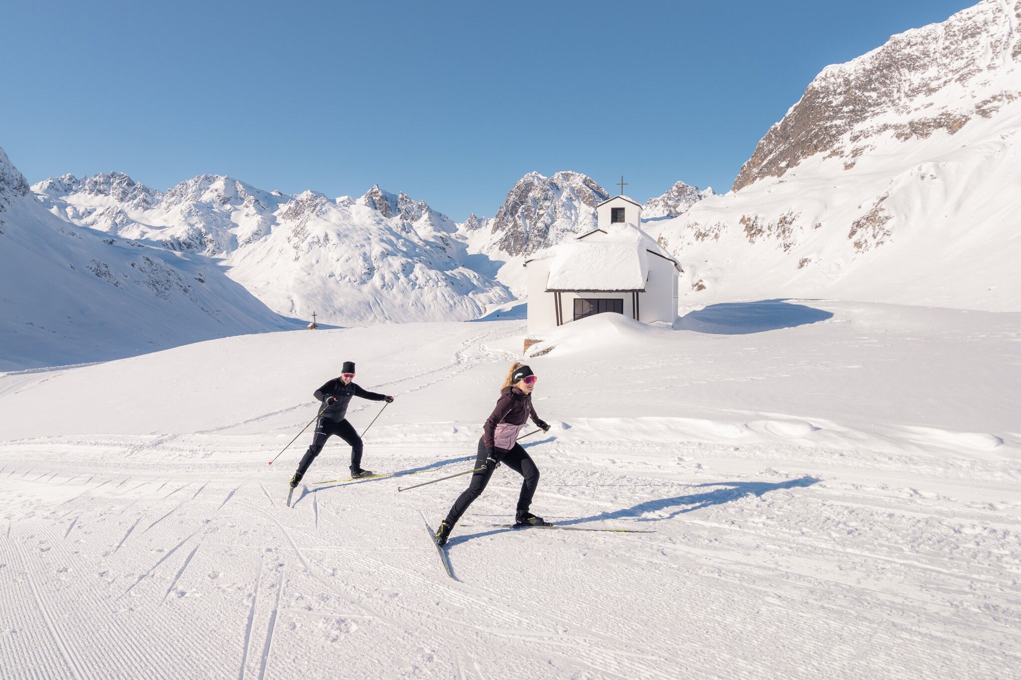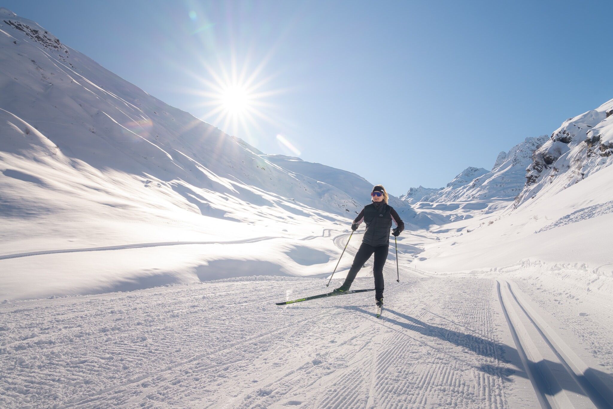 The Madlenerhaus Large Trail is the longest of the Madlenerhaus loops at 2 kilometres. It runs from the Madlenerhaus along the snow-covered high alpine road towards Partenen and back. The route features gentle climbs and descents, offering fantastic views of the imposing Silvretta dam and the picturesque valley. It connects perfectly with the Small and Medium Trails for a varied experience.