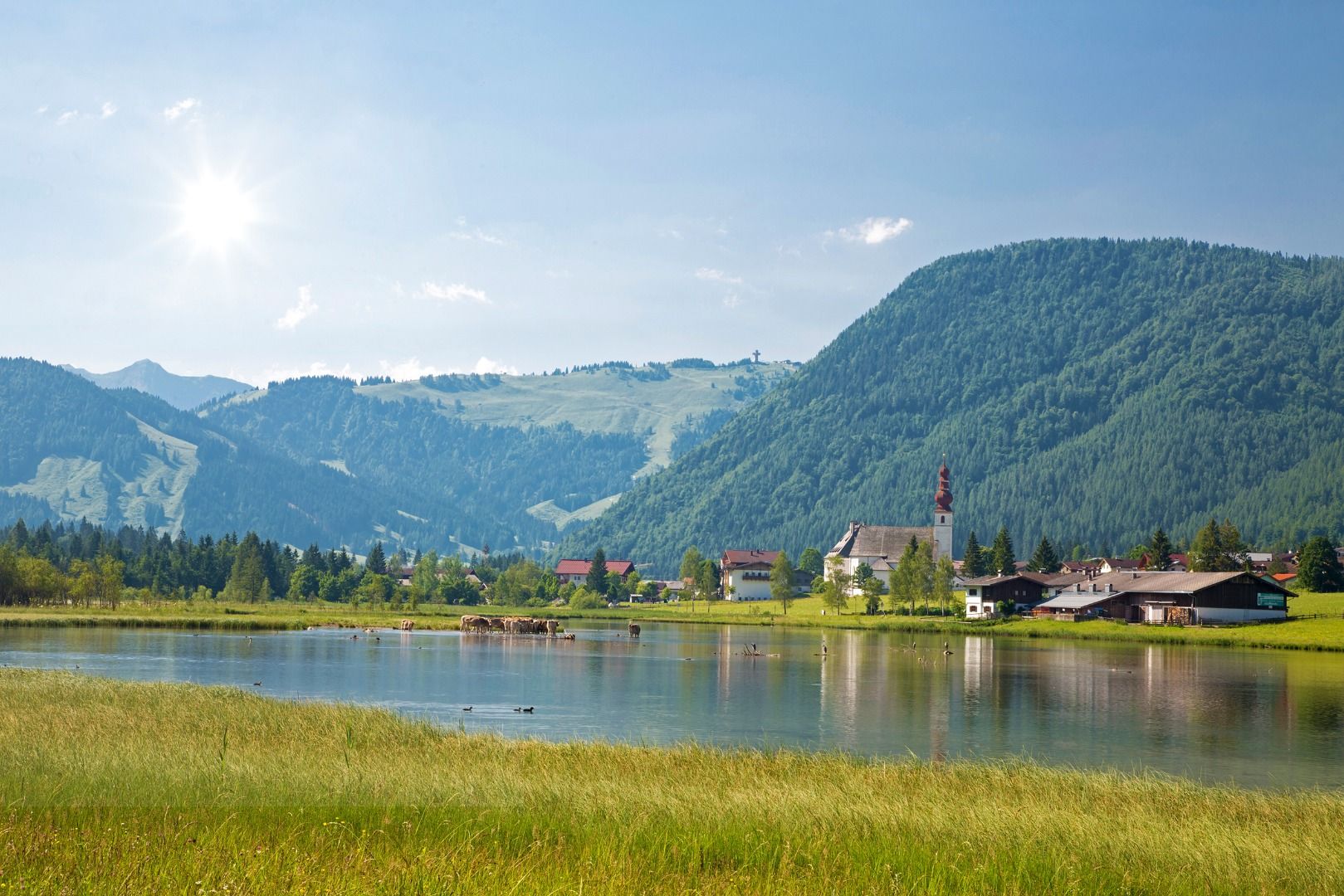 Now we ride around and quite close to St. Johann in Tirol. So if you want to visit the town briefly or stock up on supplies, you can take a little detour here and deviate from the route briefly. Then, we follow the Achendamm along the gently babbling river via Kirchdorf to Erpfendorf. If you like, you can treat yourself to a cool refreshment for your calves at the Kneipp facility right in the village centre