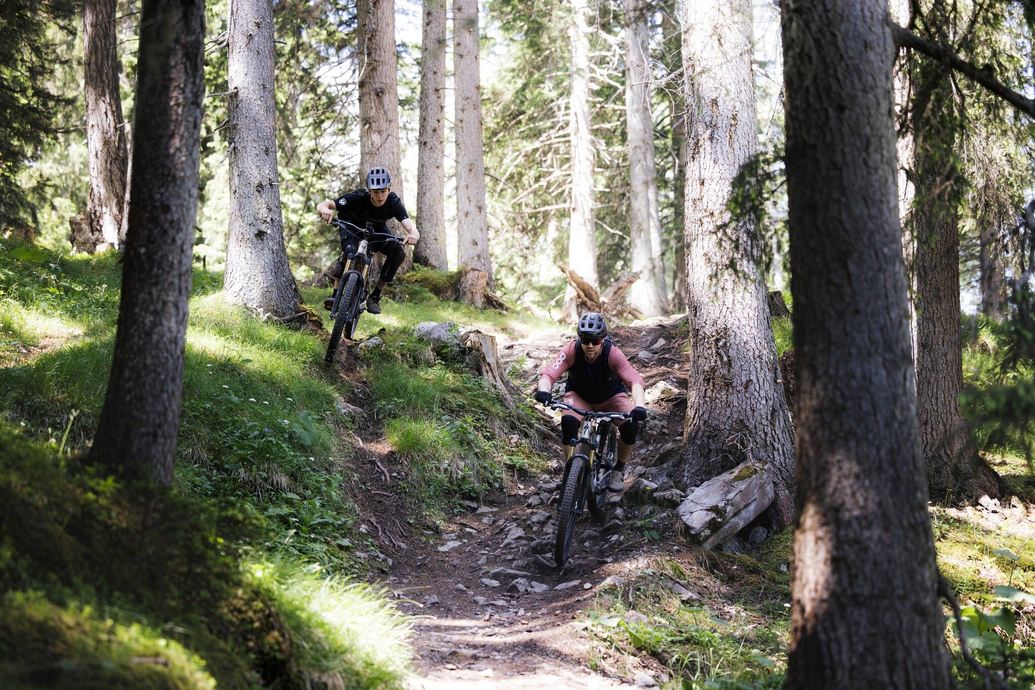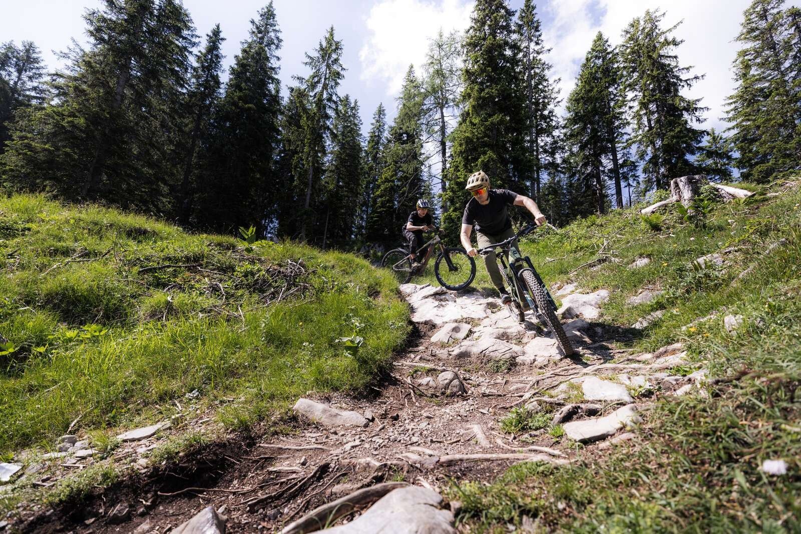 At the Grubigalm you start idyllically over a meadow in the light forest on the Grubigstein. The trail offers a natural flow, is not extremely technical or blocked, but becomes very demanding at high speeds! After crossing the gravel road, the trail returns to the forest in a similar style.