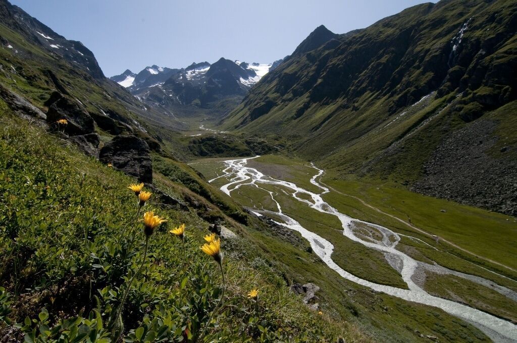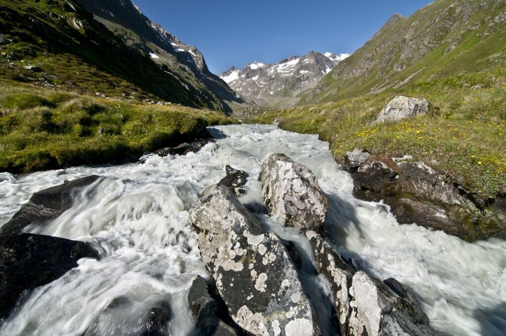 The Alpeiner waterfall and the wild and powerful Alpeiner stream tumbling into the valley are among the most beautiful water places in the Stubai Alps. The mountain hike further to the summit of the Aperen Turm leads past a deep green glacial lake, up to one of the most beautiful panoramic mountains in the Stubaital.