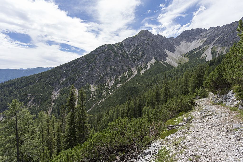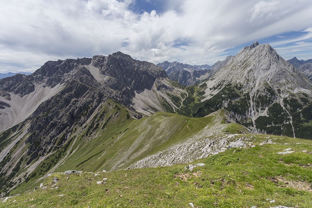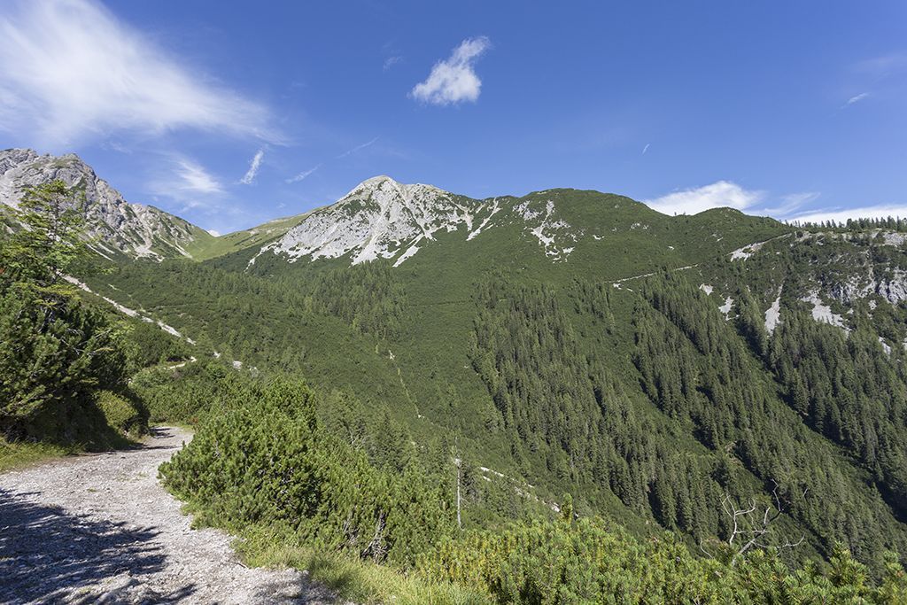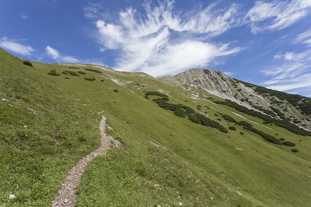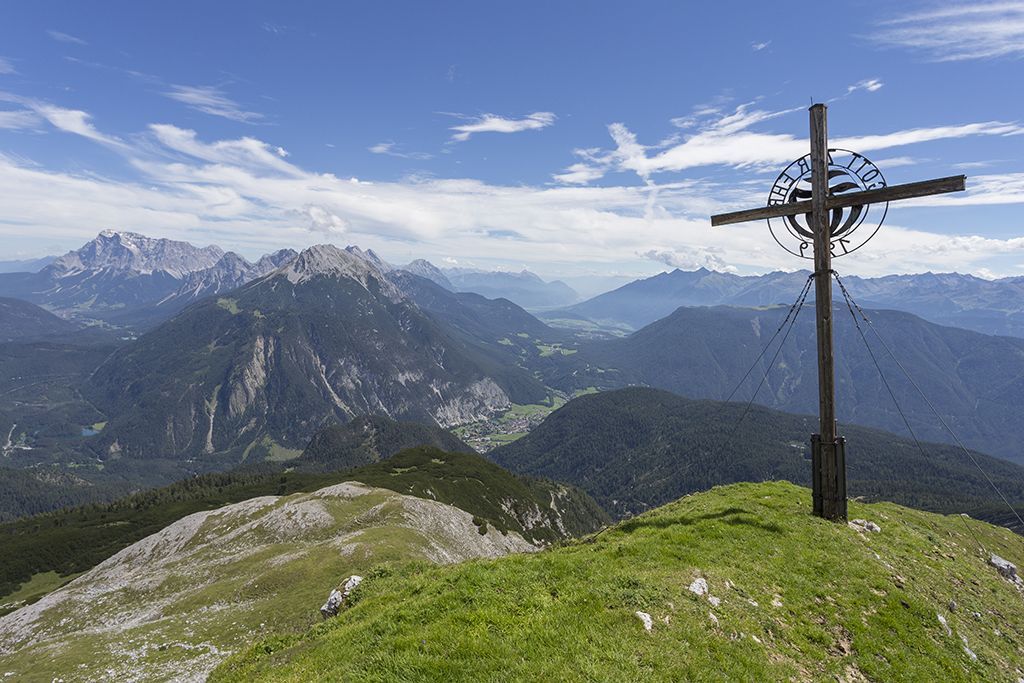 The summit tour to the Alpleskopf begins at the Sinnesbrunn parking lot and promises an unforgettable experience in the midst of nature. The trail first leads gently uphill to the small Sinnesbrunn pilgrimage chapel, which offers a wonderful place for a contemplative start. The path leads through a varied landscape, accompanied by trees, small clearings and babbling brooks, to the Sinnesgatter. Here, an impressive view of the majestic Zugspitze opens up, making the heart of every nature lover beat faster. Continue straight ahead to the small turn-off towards Alpleskopf. After a short time, you reach a beautiful mountain meadow that adorns the path up to the Reisenschuhjoch. Here you can already enjoy an impressive view of the majestic Heiterwand, which underlines the beauty of the alpine landscape. From the Reisenschuhjoch, follow the ridge to the summit of the Alpleskopf. The ascent is rewarded by a fantastic view that lets your gaze wander over the surrounding peaks and valleys. The Alpleskopf reveals itself as the perfect vantage point, rewarding hikers with an incomparable panoramic view - a summit experience to remember.