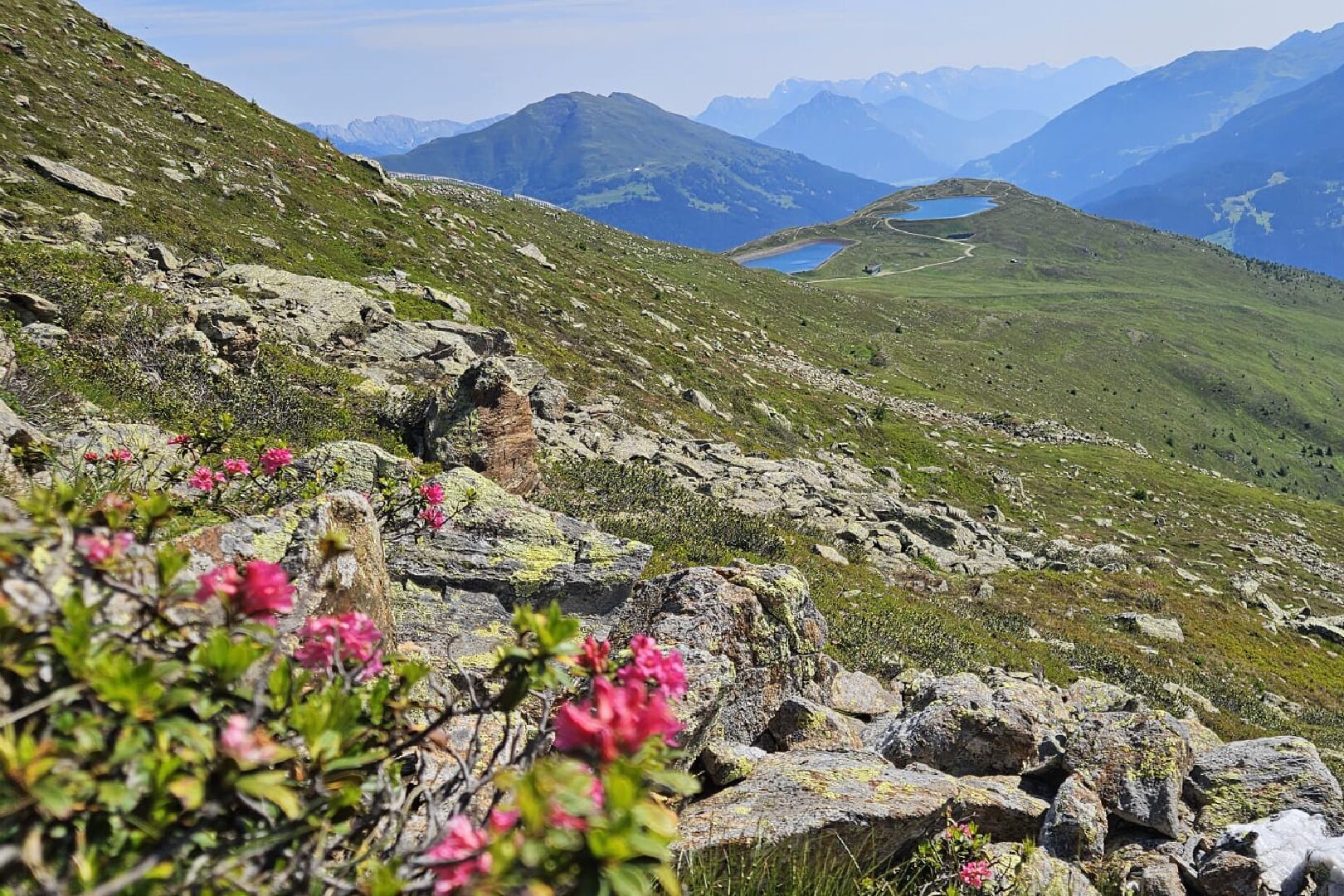 From the Steinegg (F061) take the vehicle track no. 9 to the second serpentine (F062). Then turn right onto the Fisser Höhensteig trail and the Karpensteinsteig path (F063). Just after a few meters, turn left moderately steep over high alpine pastures to a room-sized boulder (F094, Karpenstein). Now cross the vehicle track, up a bit more steeply, between the avalanche galleries onto a wide backed ridge (F084). The trail leads you left after a few