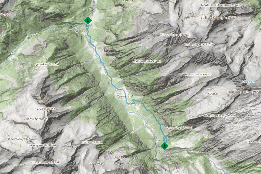 The hike starts at Alpengasthaus Breitlahner, 1.257 m and takes you via Klausenalm, 1.301 m in several switchbacks to Grawandhütte, 1.636 m, where you can enjoy a break with fantastic panoramic views. From here, you can also set off to other destinations, such as the Alpenrosenhütte, 1.878 m or the famous Berliner Hütte, 2.042 m.