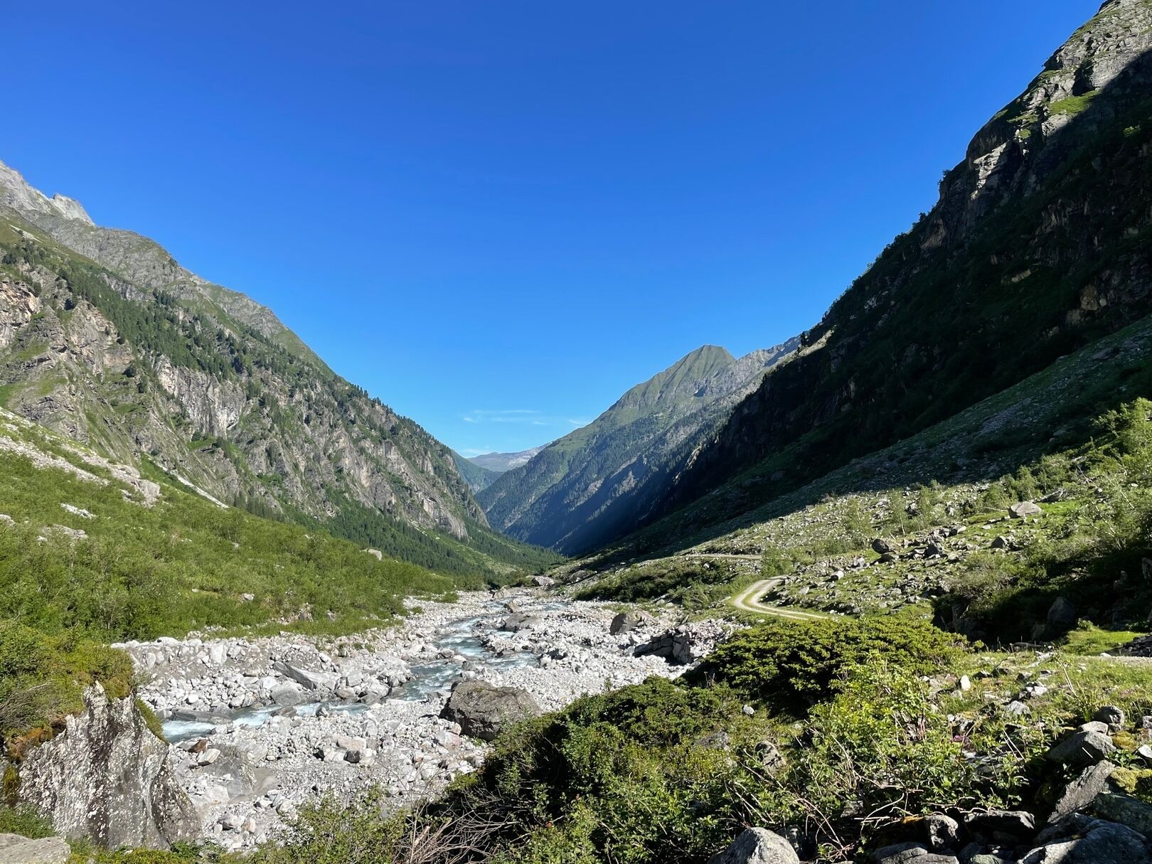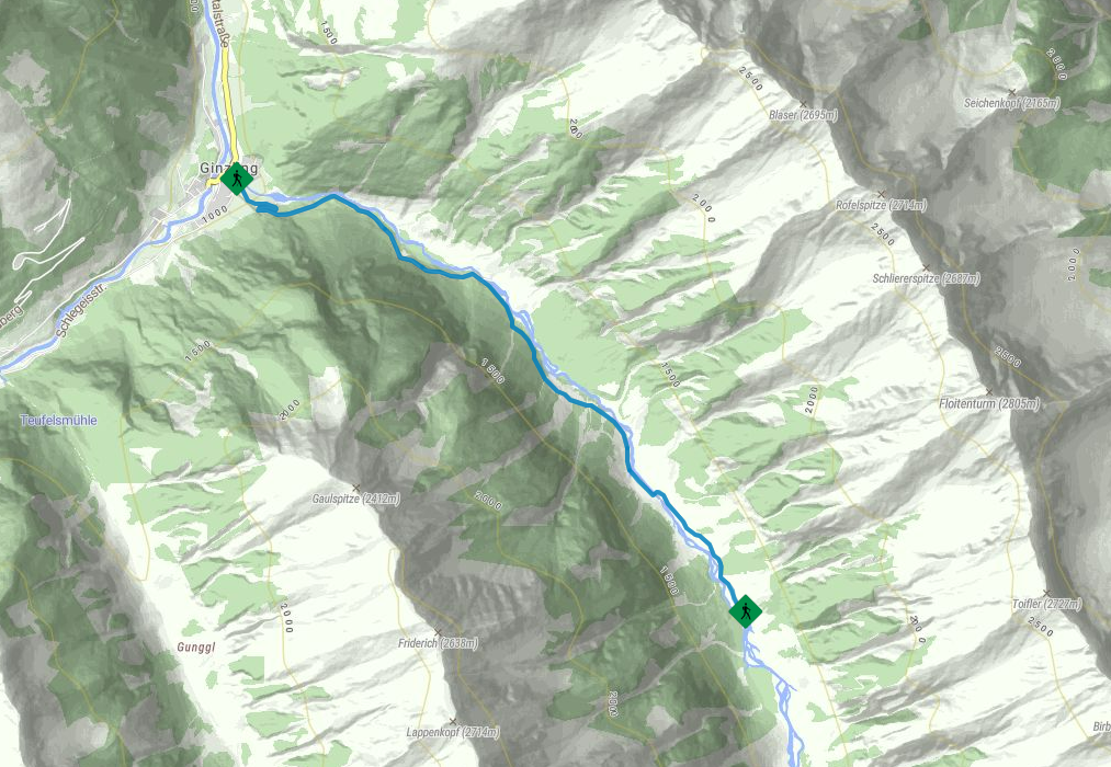 The family-friendly hike to the natural gem "Floitengrund" is easily manageable even with small children. First, trail number 521 leads you along the paved road to the Tristenbachalm, 1.200 m. From there, you follow the same trail number along the Floitenbach stream to the Steinbockhütte, 1.380 m. Both serviced huts invite you to stop and enjoy. You return via the same route.
