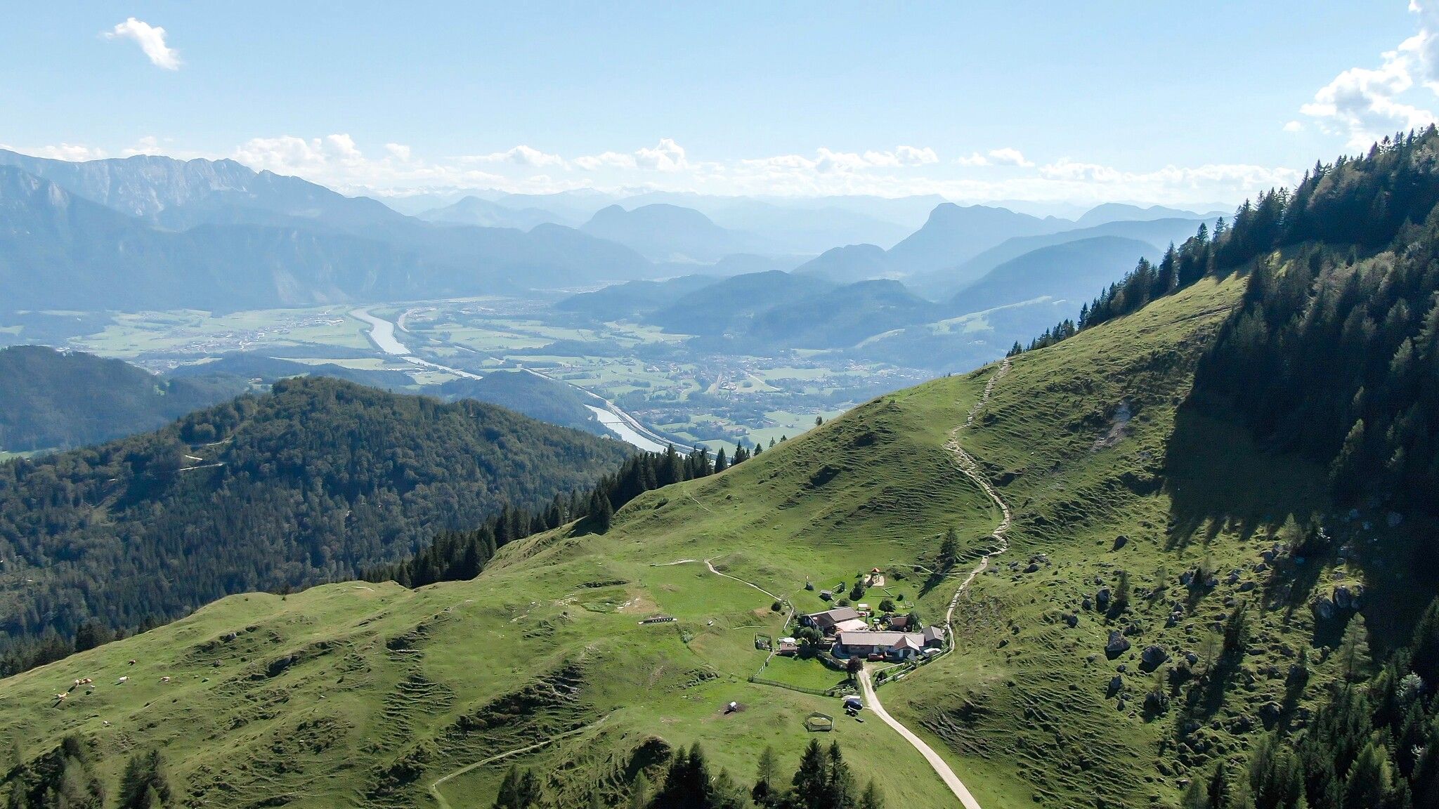 The easiest route leads from the Erler Bergstraße to the Kranzhorn (1,365 meters). From the signposted parking lot, you can reach the two summit crosses after just one hour via a comfortable, easy-to-walk forest path. The more athletic alternative leads from the Erler district via mountain paths to the summit in around two hours. At the top, you can meander wonderfully with a magnificent view.