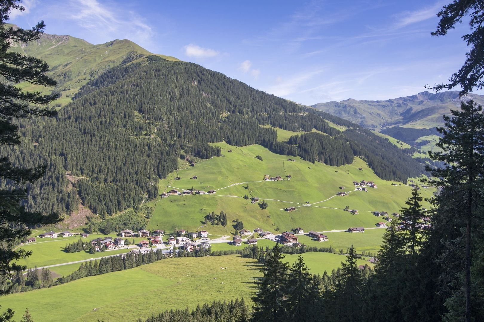 Past the Adler Inn Tirol Mountain Resort (house no. 690), over the "Goasbrücke" and turn left, along the Tuxbach (trail no. 10) out of the valley to the "Auerbauer" (house no. 662), here over the "Auerbrücke" to the road, this is crossed out of the valley after about 70 m, left into the forest (trail no. 21), past the Tuxer Mühle. Ascent to the Zarge (house no. 578), stay on the road from "Oberjuns" (trail no. 21), past the Reuttenhof (house no. 567) and descent to Tux-Lanersbach.