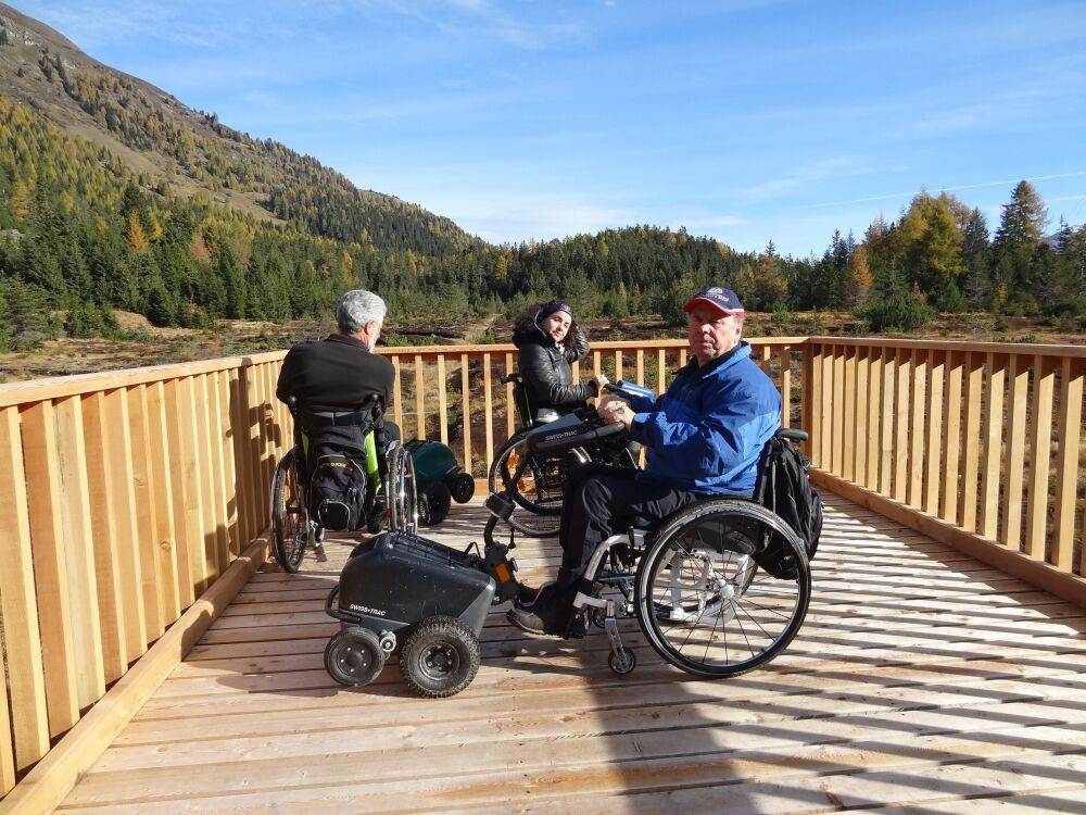 It is approximately 500 metres on a gravel path to the turf house square [Torfhüttenplatz] where the path forks off. Turn left to get to Piller Moor natural landmark and the moor observation tower or turn right to walk past the winter feeding station and a path that leads to the peat cutting area. After approximately 200 metres you will reach a platform, which reveals a view of the “Putzenmoos” that is well worth seeing. Here, peat was still cut until the early 1970s. The wheel-chair accessible path then continues for approximately 300 metres until you reach the moor. From there, the road is no longer suitable for wheelchair users.