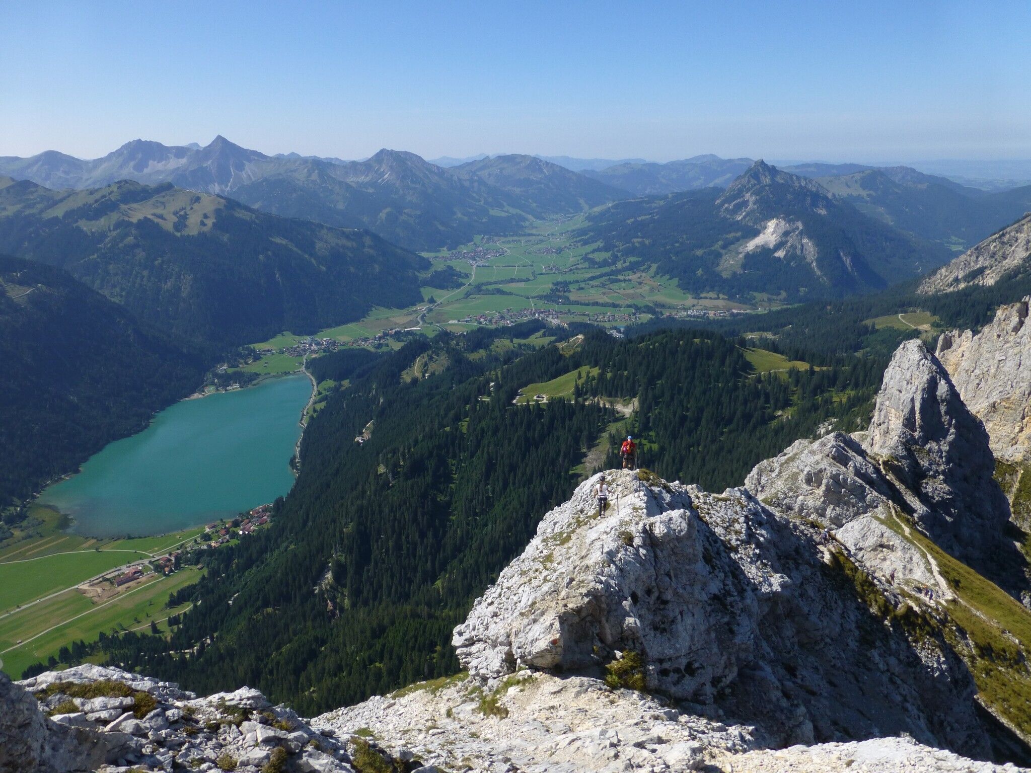 From Nesselwängle, Gimpelhaus parking lot, ascent to Gimpelhaus, further to Judenscharte and to Rote Flüh, approx. 4 hours. ATTENTION!! Partial rope protection in place, surefootedness and a head for heights required, especially take care when wet. Same descent back to Gimpelhaus or Tannheimer hut (both huts offer overnight accommodation) to Nesselwängle, approx. 2 1/2 hours. Total walking time approx. 6 1/2 hours.