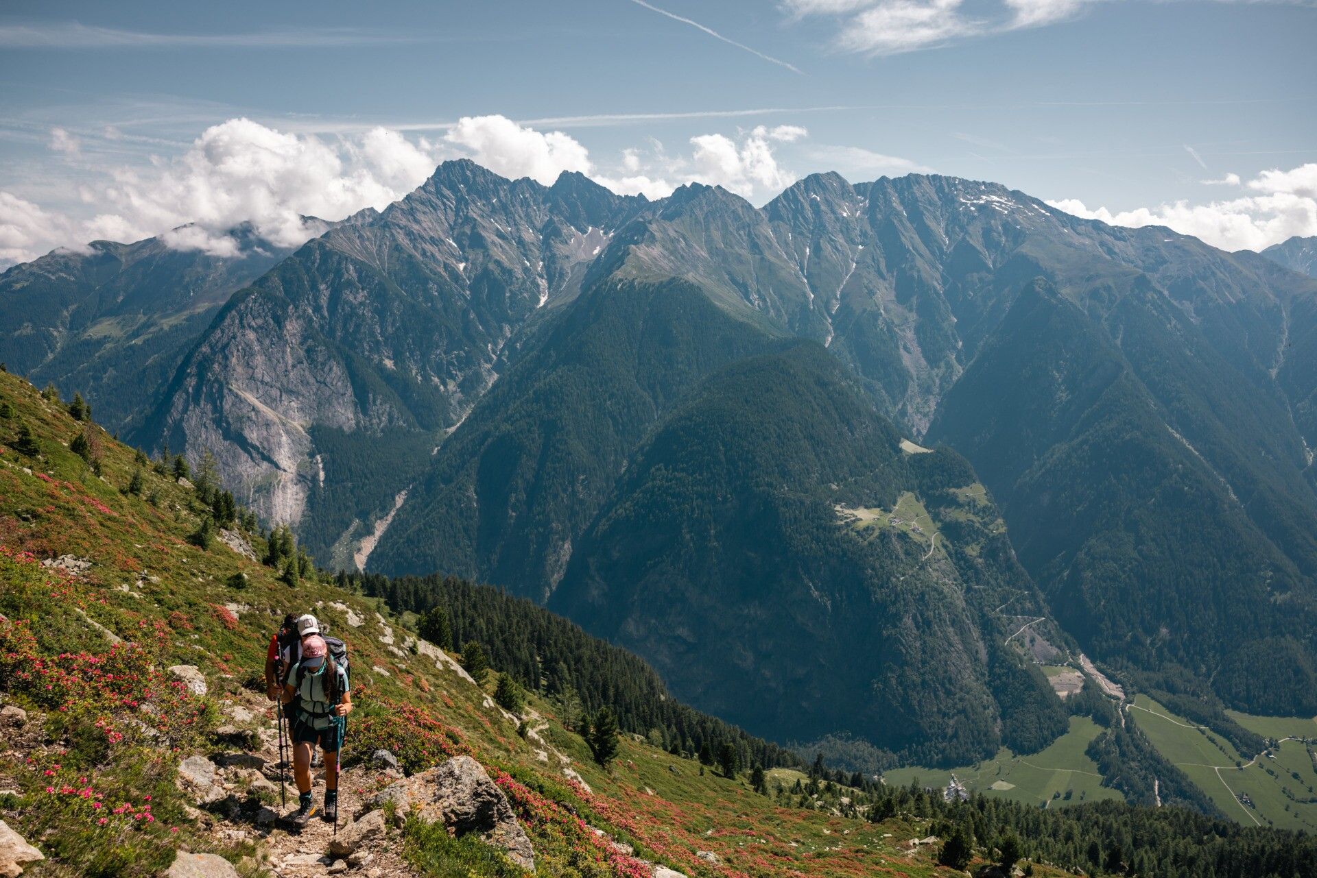 Appropriate equipment for alpine mountain hikes is a matter of course on all tours in the Alps. Sure-footed hiking boots or mountain shoes, breathable outdoor pants, a rain jacket, as well as a backpack with provisions, drinks, and a first aid kit always belong to the standard equipment for tours in the Alps. Sunglasses, sunscreen, headgear such as a bandana or hiking hat are also highly recommended, as well as a warm second jacket, trekking poles if desired, and possibly gloves. The choice of clothing should of course always be adapted to the current weather .