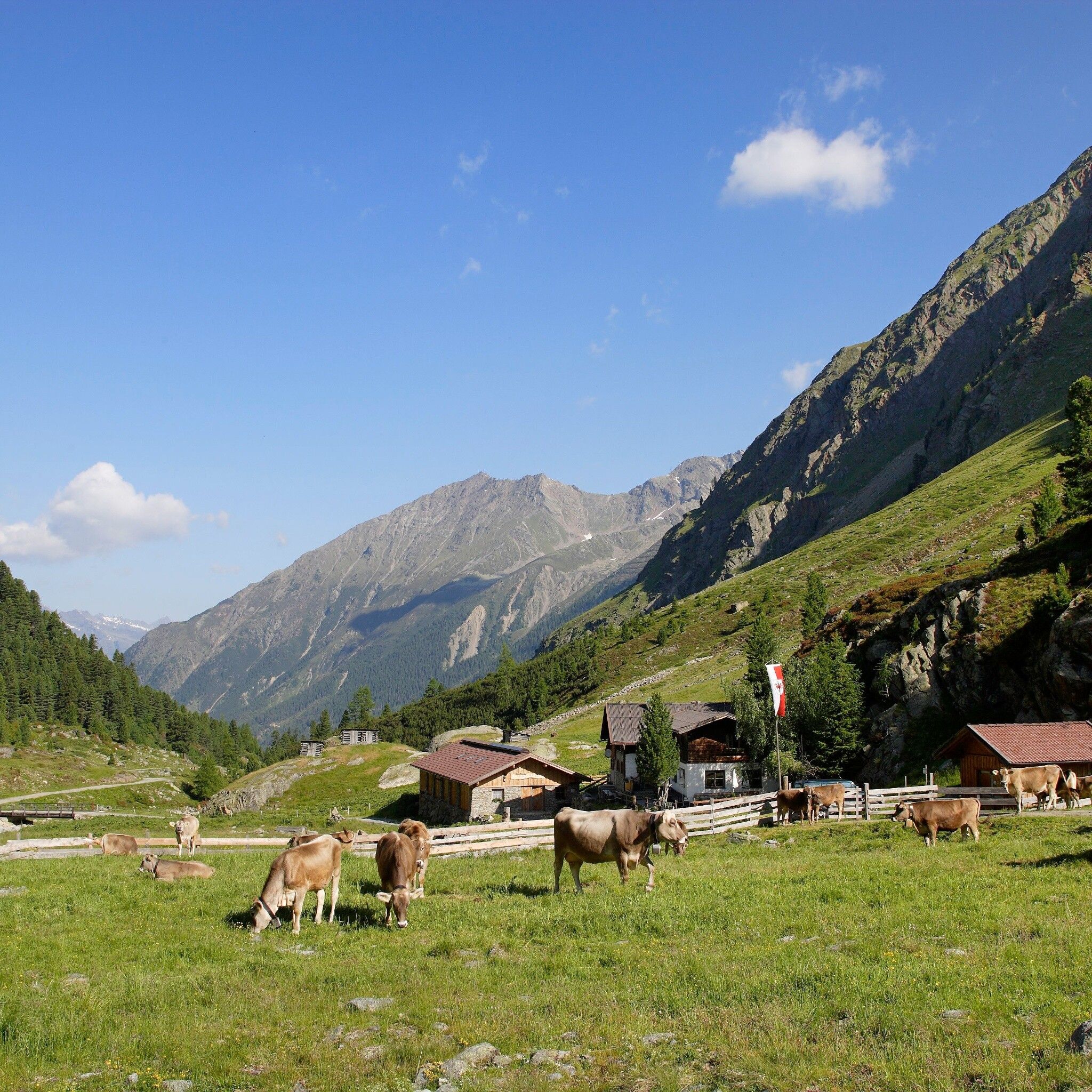 The starting point is the parking lot at the outskirts of Gries. From here, follow a gently ascending forest path towards Sulztalalm. Passing meadows and the Vögelasbrücke, you will soon reach the junction where you follow the forest path to the Sulztalalm. Continue hiking along the forest path with a gentle incline up to the Sulztalalm.