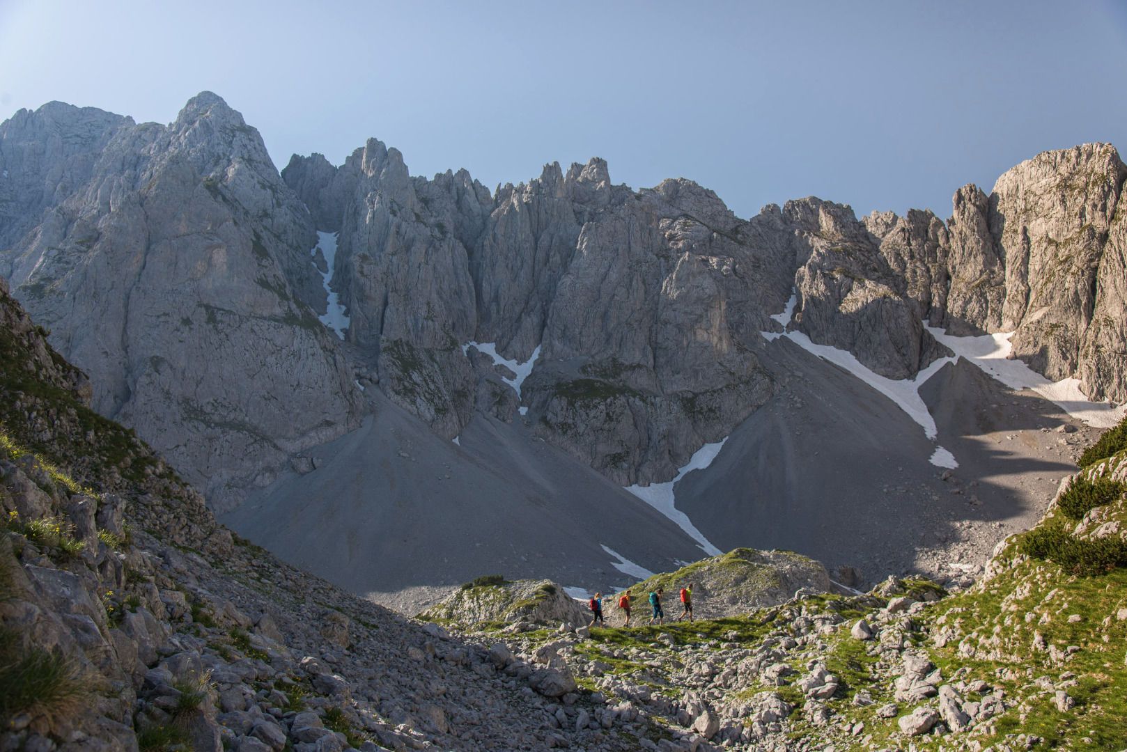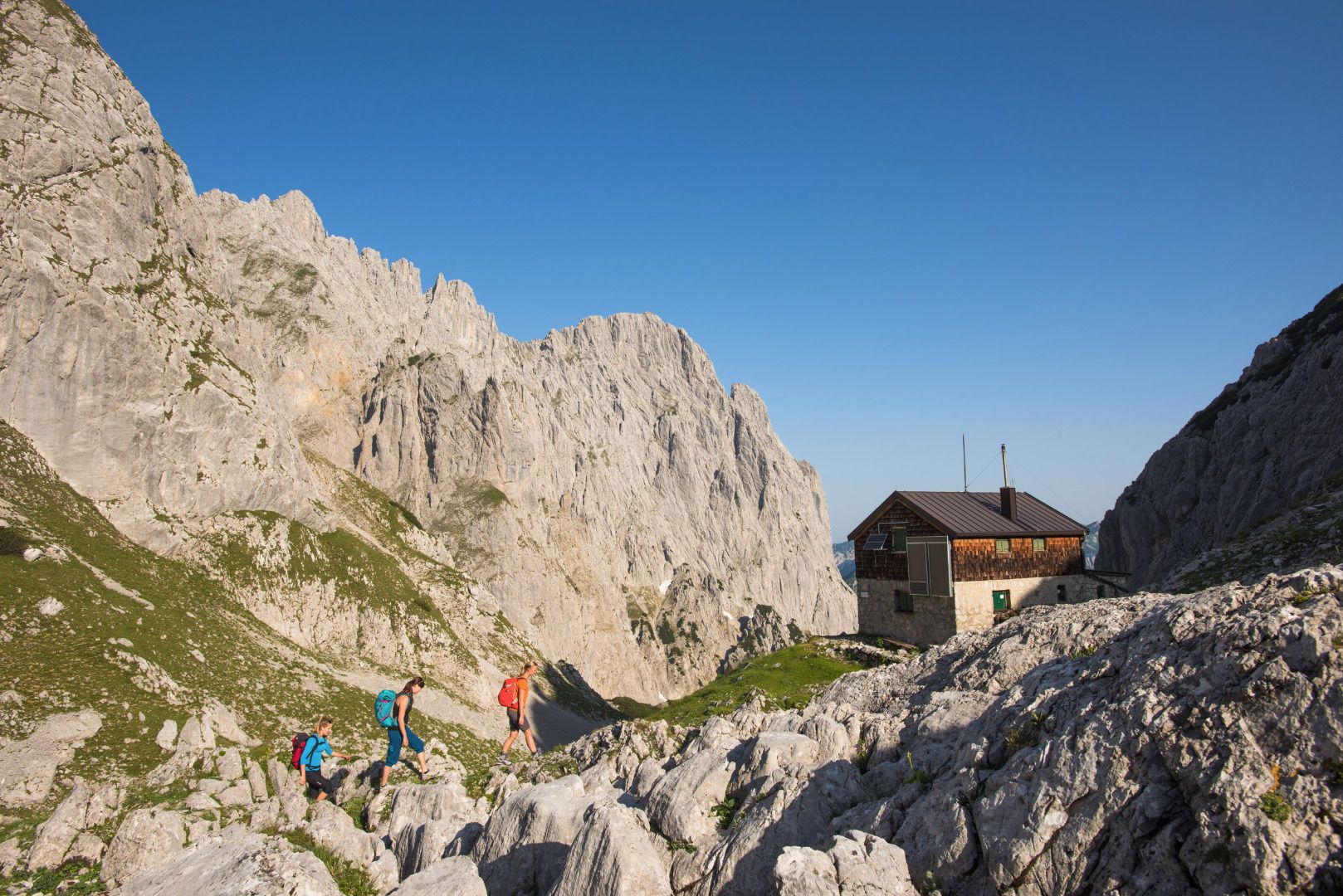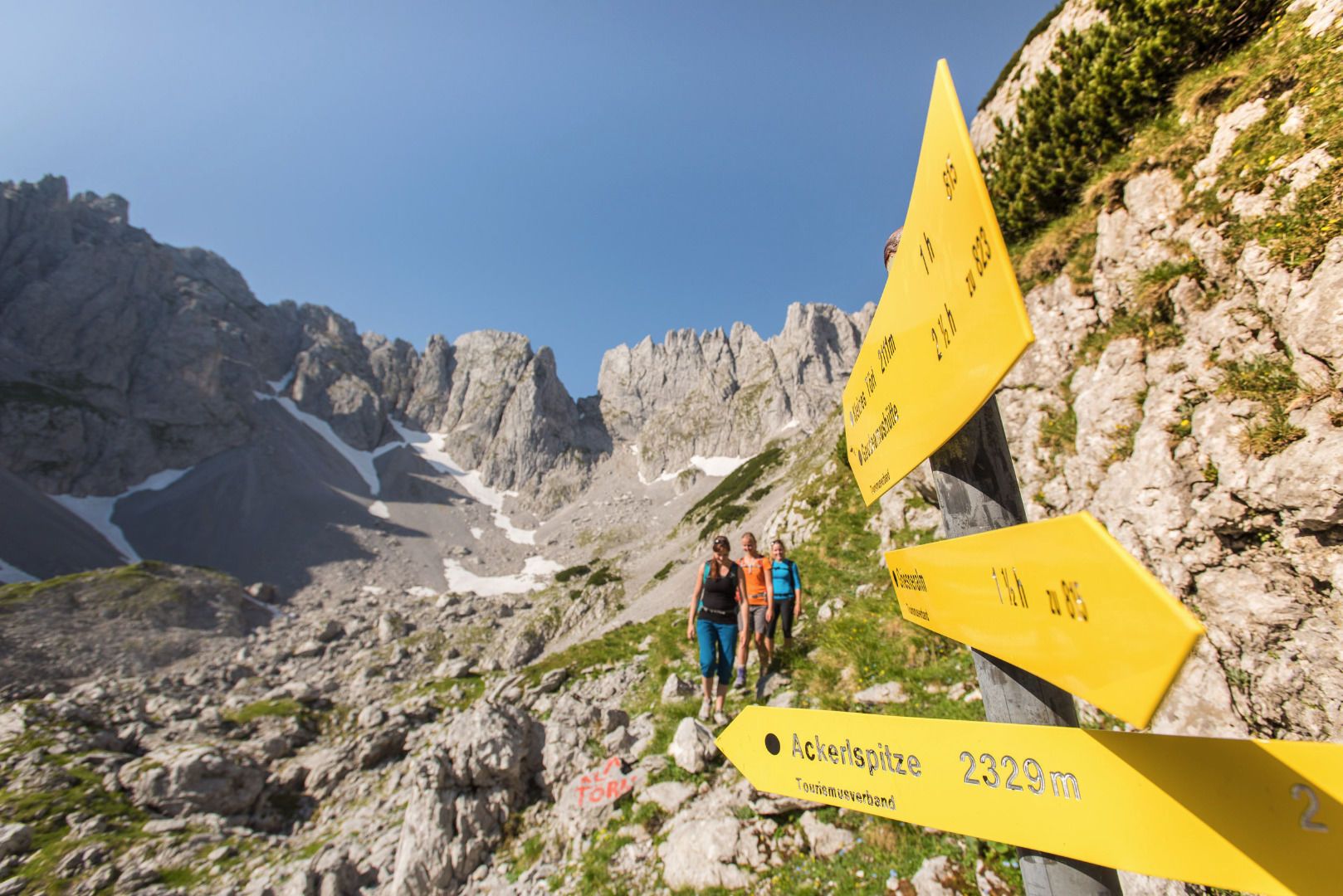 The hike starts at the Griesner Alm. Initially, it leads along a well-maintained hiking trail. At the first fork, choose the path in the direction of Fritz-Pflaum-Hütte. Flanked by the Mitterkaiser, Predigtstuhl and Hinterer Goinger Halt, the mountain trail leads through the Grosses Griesner Kar up to the Fritz-Pflaum Hut in the Griesner Kar. Here you have a breathtaking view of the surrounding peaks of the Wilder Kaiser. Along the walls of the Kleinkaiser, the mountain trail leads over to the Kleines Törl. Attention: In this area there are numerous chamois on the move, so you should definitely wear a helmet because of possible falling rocks. Accompanied by impressive images, you hike up to the Kleines Törl, located 2100 meters above sea level. Via the beautiful Gildensteig you walk past the Wilderer Kanzel down to the Bergsteigergrab (mountaineer's grave) at the Brennender Palven. At this place the teacher Much Wieser, a great lover of the Wilder Kaiser, was buried on October 17, 1952. Continue hiking down to the Obere Regalm and from here you will reach the Graspoint Hochalm and the Schleier Waterfall - the climbing paradise. A little below the Schleier waterfall is the Graspoint Niederalm, a small snack station. The tour ends at the parking lot Hüttling in Going.
