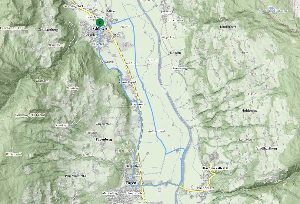 Schlitters - Fügen - SchlittersDifficulty: easy Length: 9.9 km Duration: 2:30 h Elevation uphill: 45 m See trailSee trail: Schlitters - Fügen - Schlitters