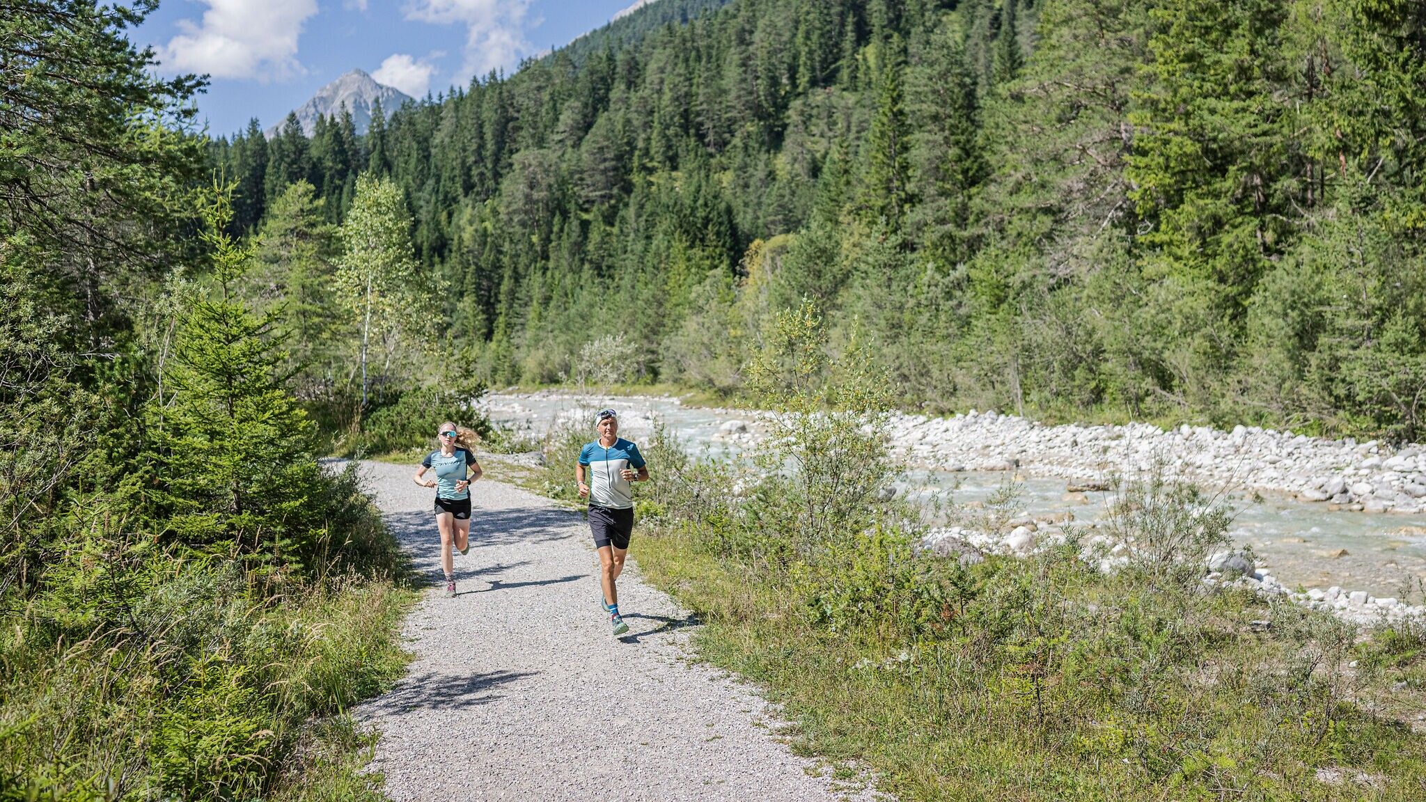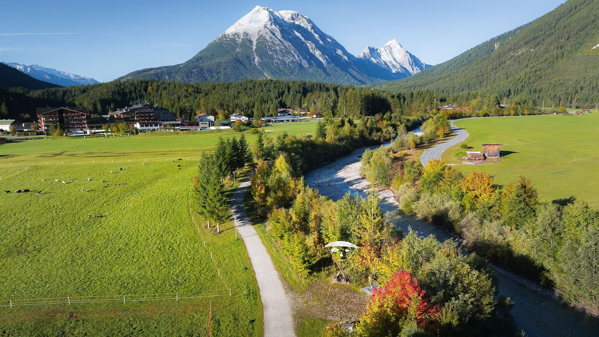 At the junction, keep left towards Kirchplatzl. From here, you reach the Leutascher Ache, which accompanies the entire valley and provides a refreshing breeze in summer. From this point, follow the river downstream – a beautiful section with steady, even running passages.