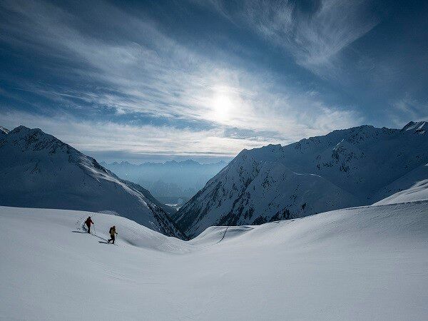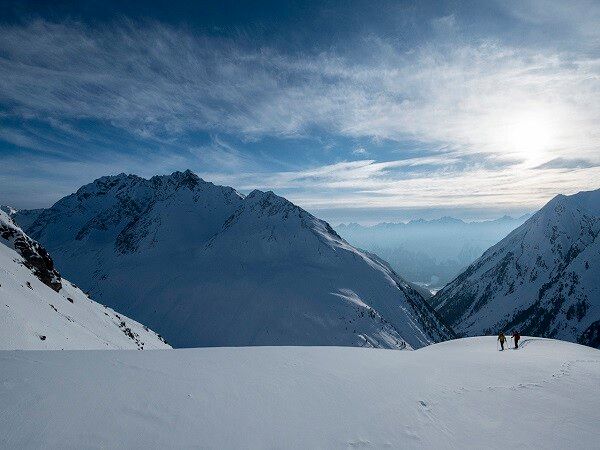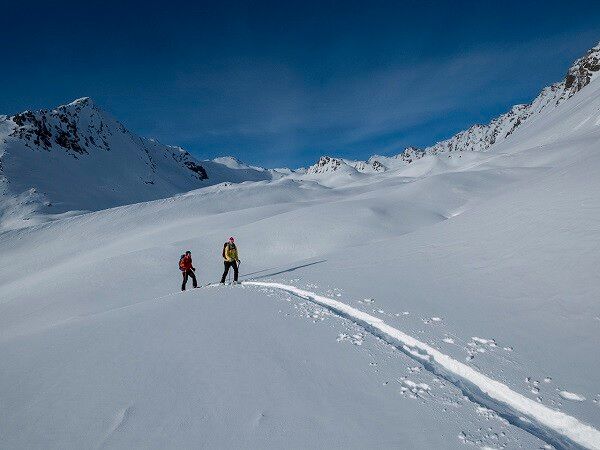 The "standard ski touring equipment" consists of touring skis with touring bindings, telescopic poles, climbing skins, crampons, digital avalanche transceiver, avalanche shovel, avalanche probe, first aid kit, and a mobile phone. A backpack with appropriate contents should be carried along, including spare clothing, sun protection, cold protection, provisions, and enough to drink! For hut overnight stays, don’t forget to bring hygiene articles and a hut sleeping bag!