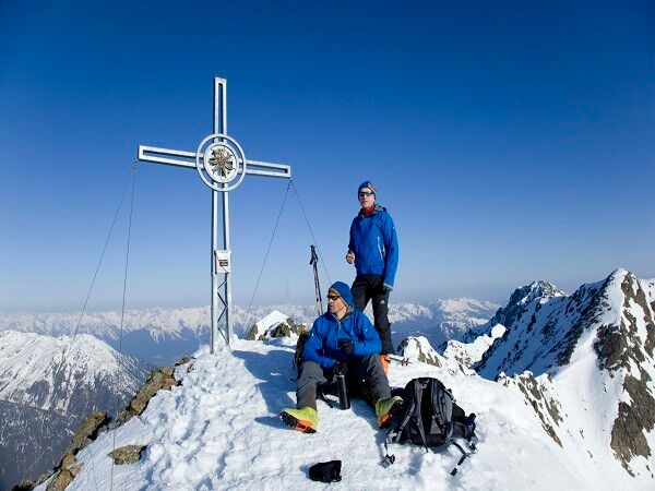 The "standard ski touring equipment" consists of touring skis with touring bindings, telescopic poles, climbing skins, crampons, digital avalanche transceiver, avalanche shovel, avalanche probe, first aid kit, and a mobile phone. A "complete glacier equipment" consists of harness, two differently sized prusik loops or ascenders, two HMS carabiners, ice axe, crampons, and a rope. A backpack with appropriate contents should be carried, including spare clothing, sun protection, cold protection, food, and enough to drink! For hut overnight stays, do not forget to bring hygiene articles and a hut sleeping bag!#