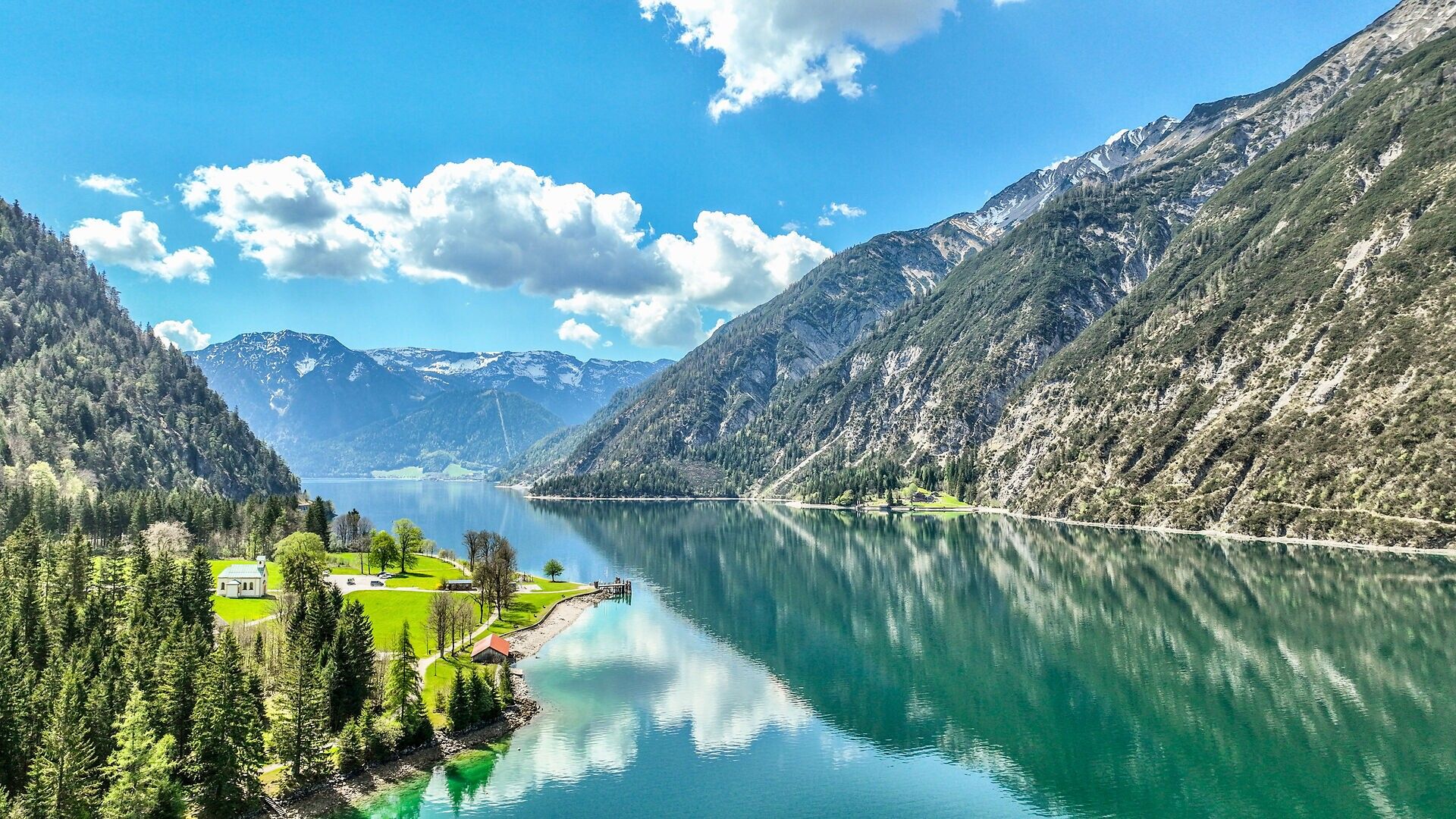 The Achenseehof bathing beach features a spacious lawn ideal for sunbathing and play, along with a children’s playground for younger visitors. Food trucks provide refreshments, and sanitary facilities are available on site. Dogs are welcome, and the Achenseehof shipping pier is just a short walk away. From the beach, you can enjoy stunning views of the Gaisalm.