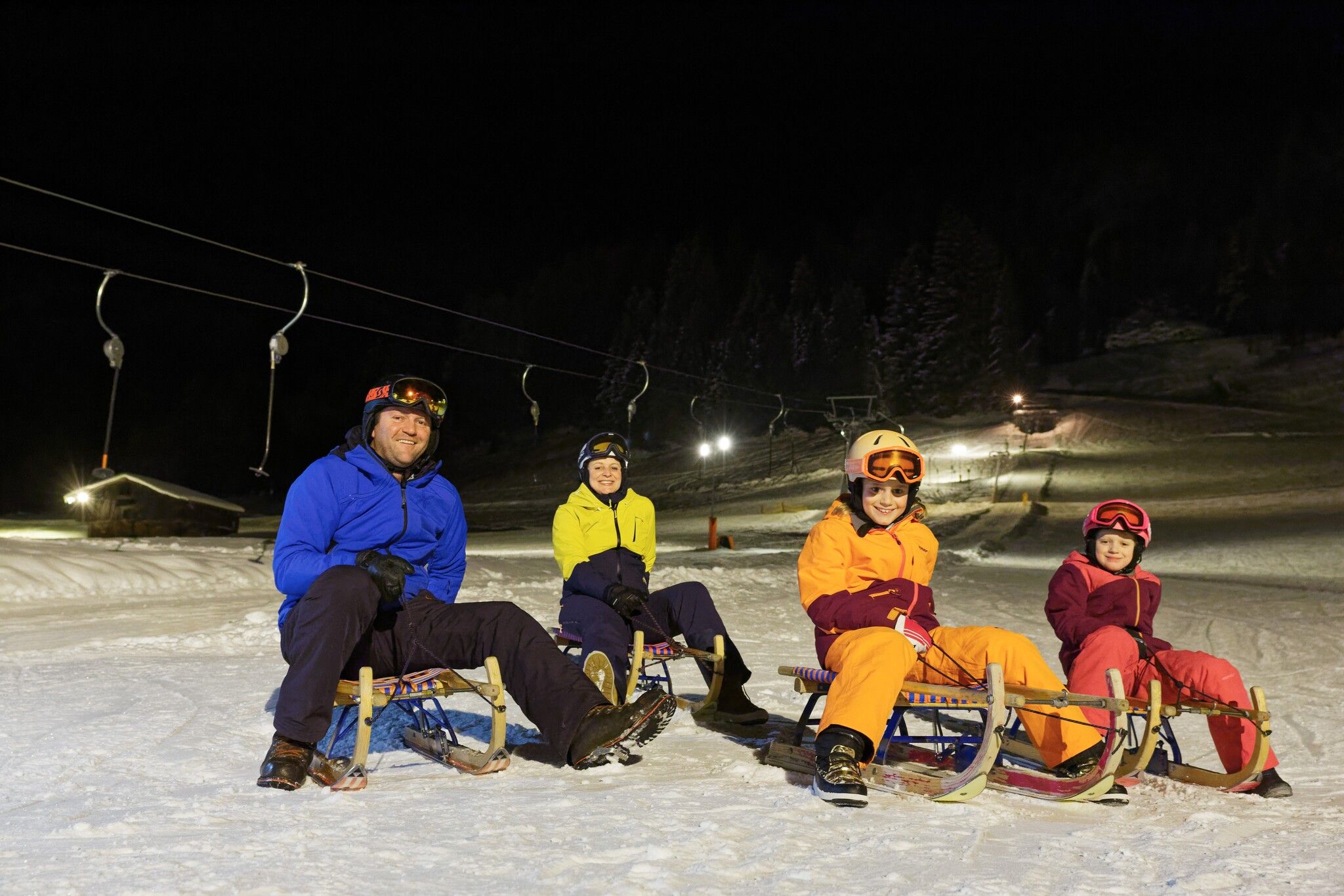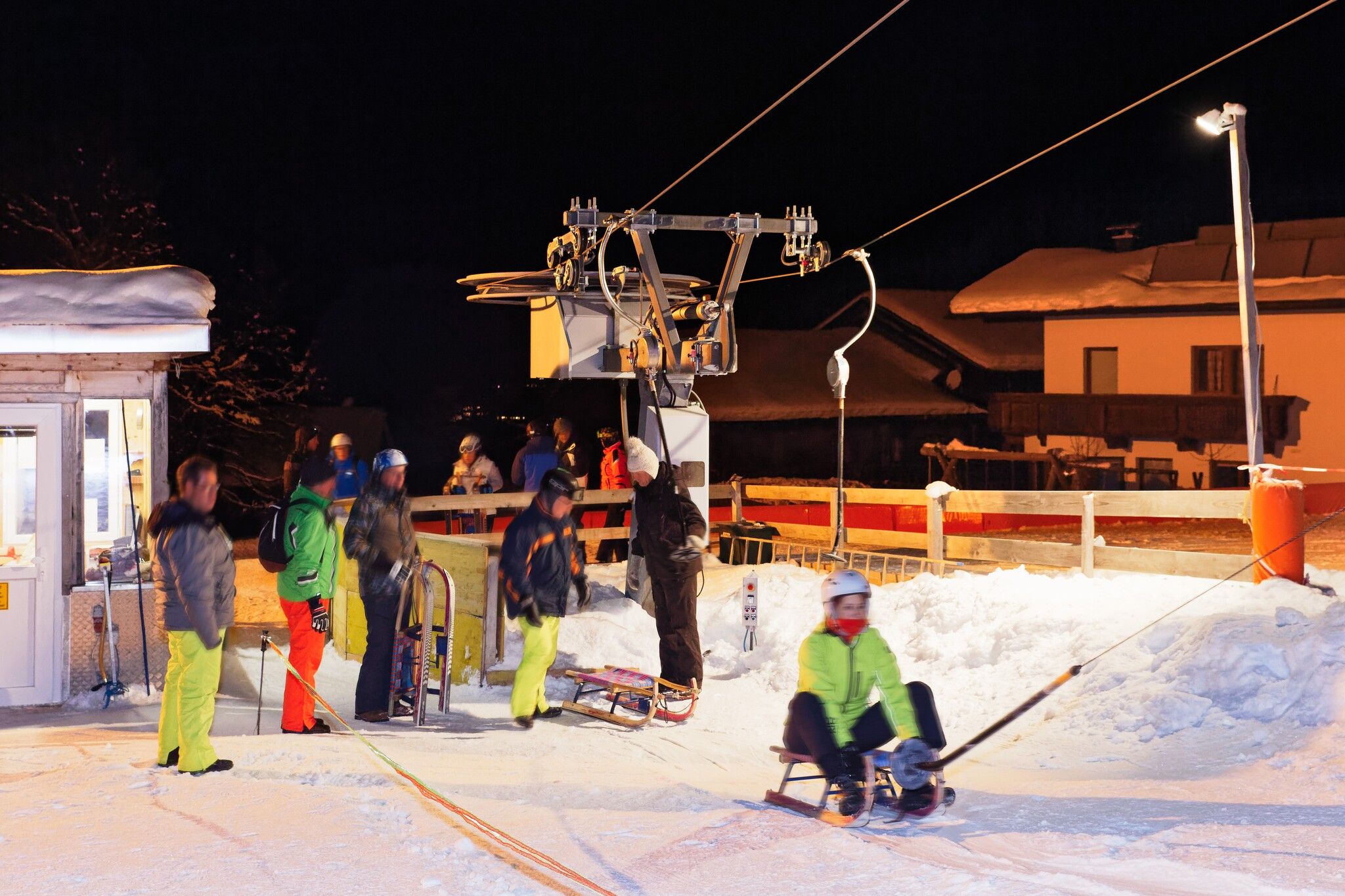 Tobogganing fun with floodlights. At Roggenboden, the descent is tackled with specially developed toboggans. The hook construction enables an easy and comfortable ascent with the drag lift.