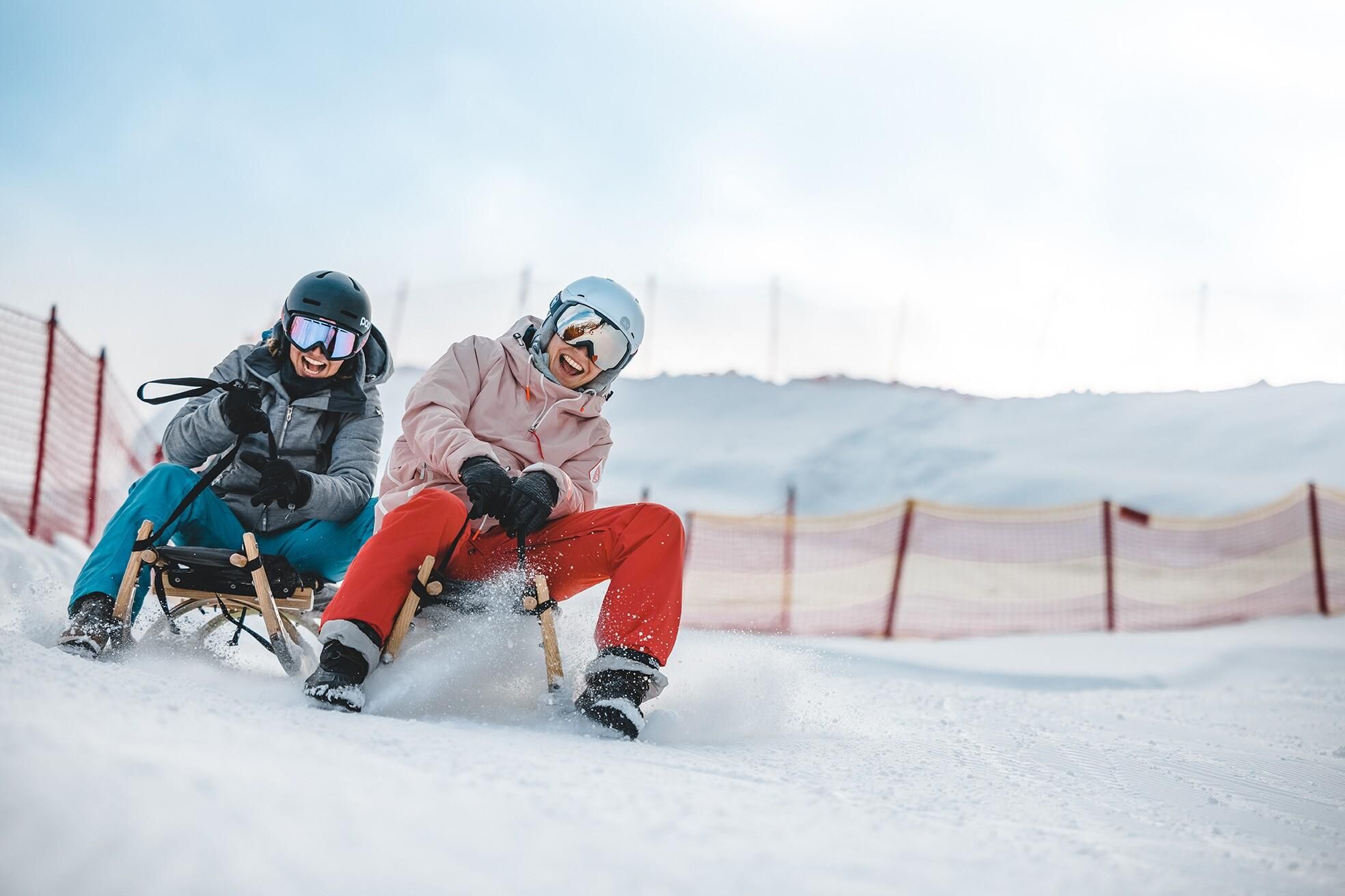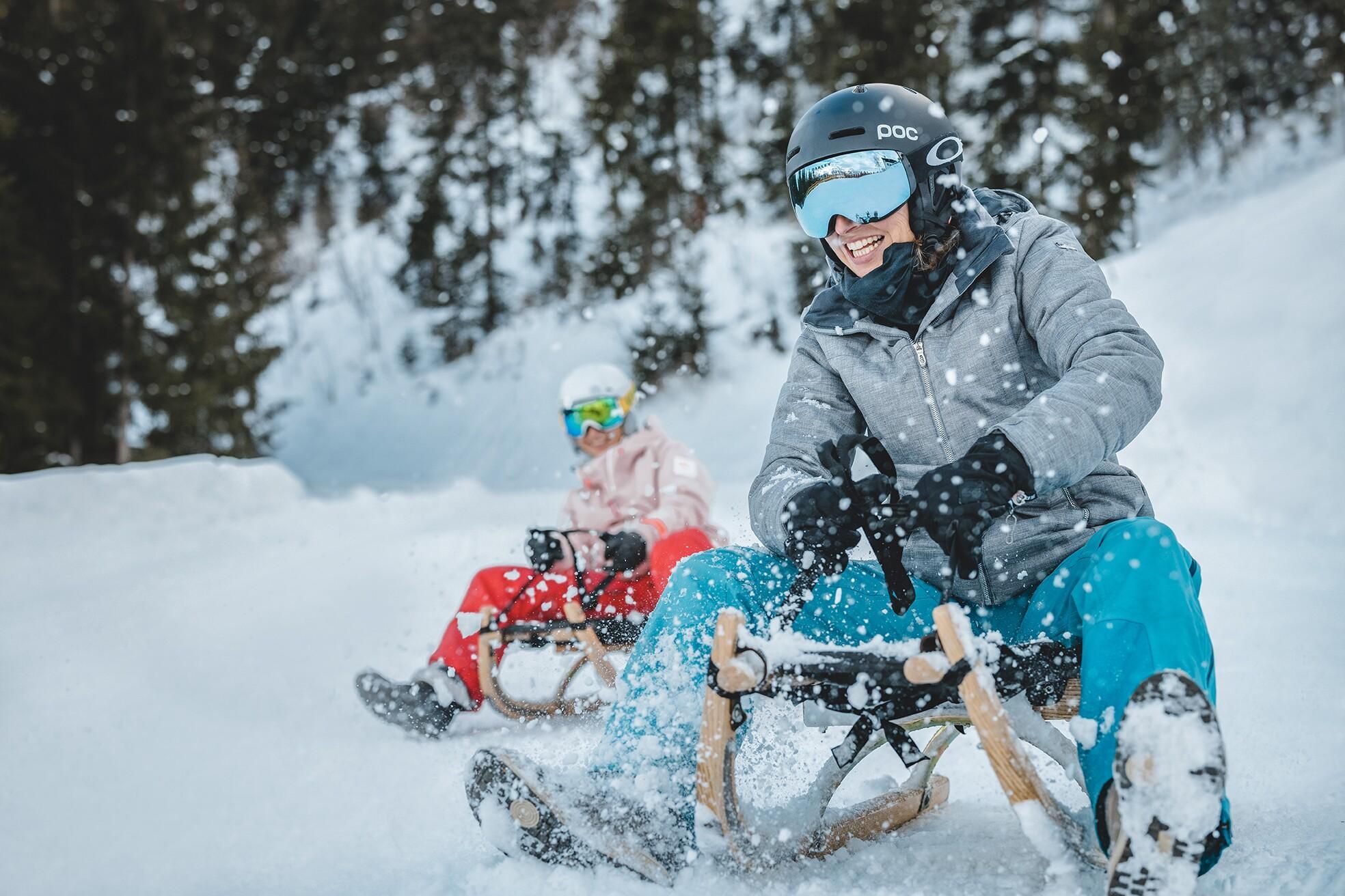If you want to walk your toboggan up onto the mountain, it’s a one hour hike from Ellmau Parish Church up to the Astberg to the toboggan run’s first entrance by the Treichlhof. If you want to go up to the very top, it’s another 15 minutes to the jezz Alm. There’s also the option of taking the Astbergbahn lift to the toboggan run. After a short refreshment stop at one of the huts you can race down the 4.5 kilometre run through the forest into the valley. The last third sees the run divide, taking you either to the Hotel der Bär in Ellmau or directly to the valley station in Going. You can also ride down in the evening as the run is floodlit.