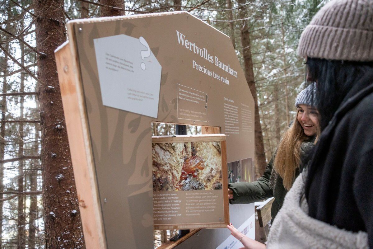 The winter hiking trail starts at the tourist information office in Pfunds and leads towards the district Dorf. Following the slightly ascending marked path, you soon reach the entrance to the forest trail “Waldgeheimnisse Badsteig”. This specially designed and illuminated trail leads through a quiet forest above the meadows and features several stations with small tasks and playful elements that provide fun for both children and adults. The path winds through the forest with occasional views of the surrounding landscape before finally reaching the Kajetansbrücke.