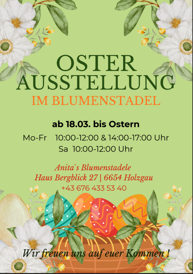 Osterausstellung im BlumenstadelPlace:Holzgau::19. Mar 2026 - 04. Apr 2026:see the eventsee the event: Osterausstellung im Blumenstadel