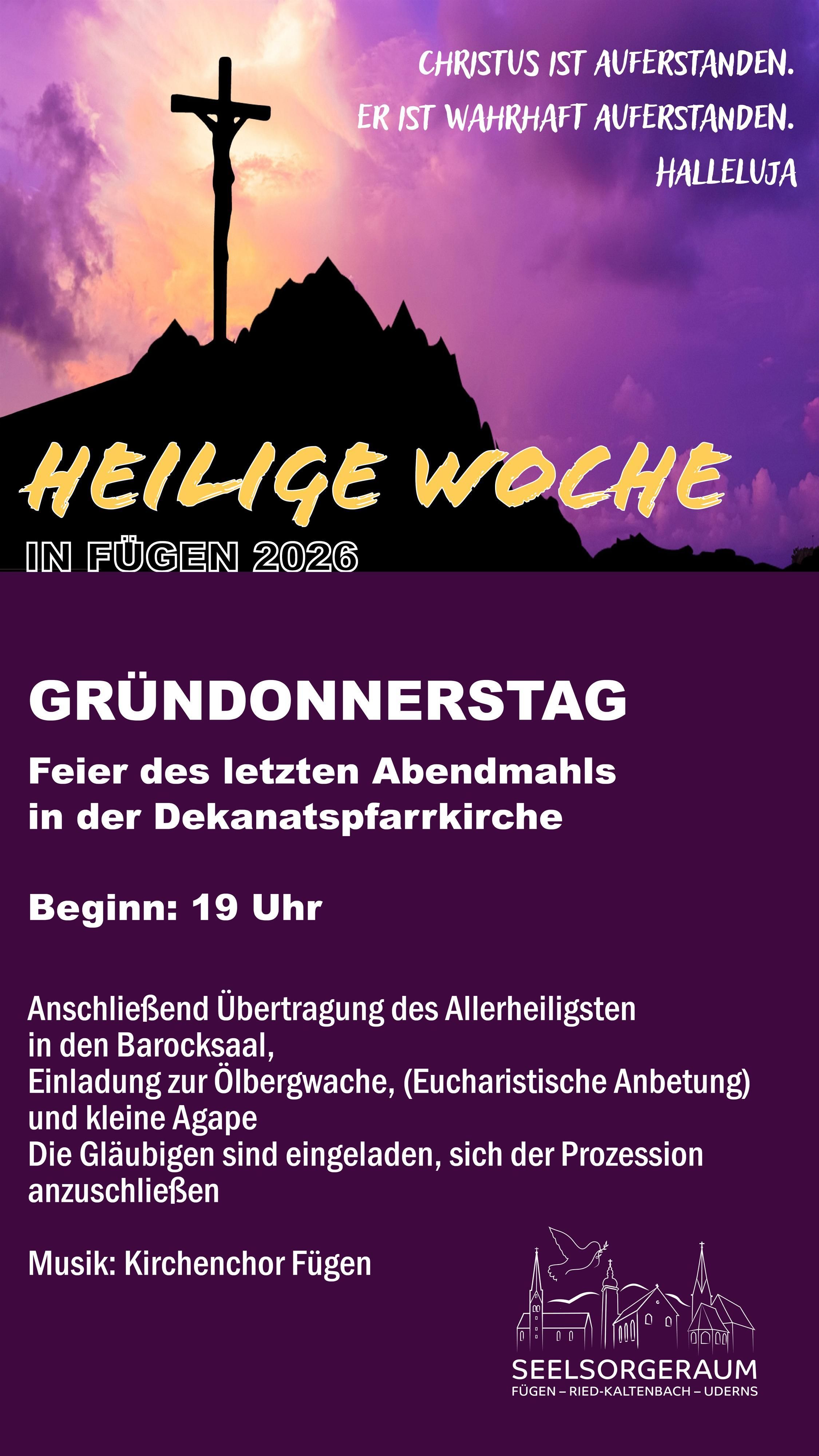 Gründonnerstag © Pfarre Fügen Maundy ThursdayPlace:Fügen::02. Apr 2026:see the eventsee the event: Maundy Thursday