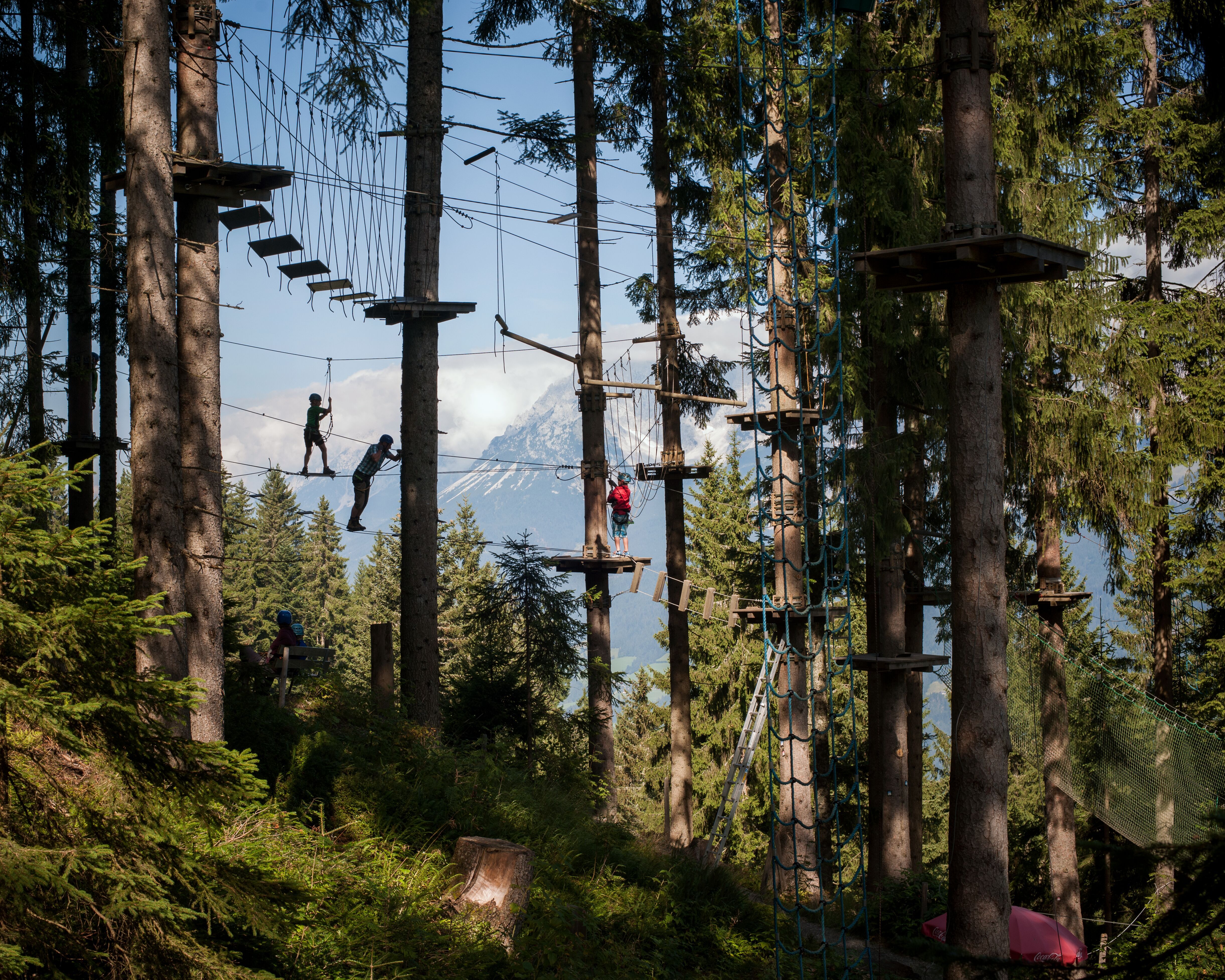 There are many ways of proving your courage and overcoming your inner daredevil... but hardly any of them are as safe and require as little prior knowledge and equipment as the courses in the Tyrolean high ropes courses. With a double carabiner safety device, you can balance at dizzying heights through creative exercises or hurtle to the finish line on a flying fox (optionally also over streams, mountain lakes and smaller valleys). And if you run out of courage, you can get off the course at most points and be accompanied back to the ground. However, this rarely happens - the tightrope acts are simply far too much fun.