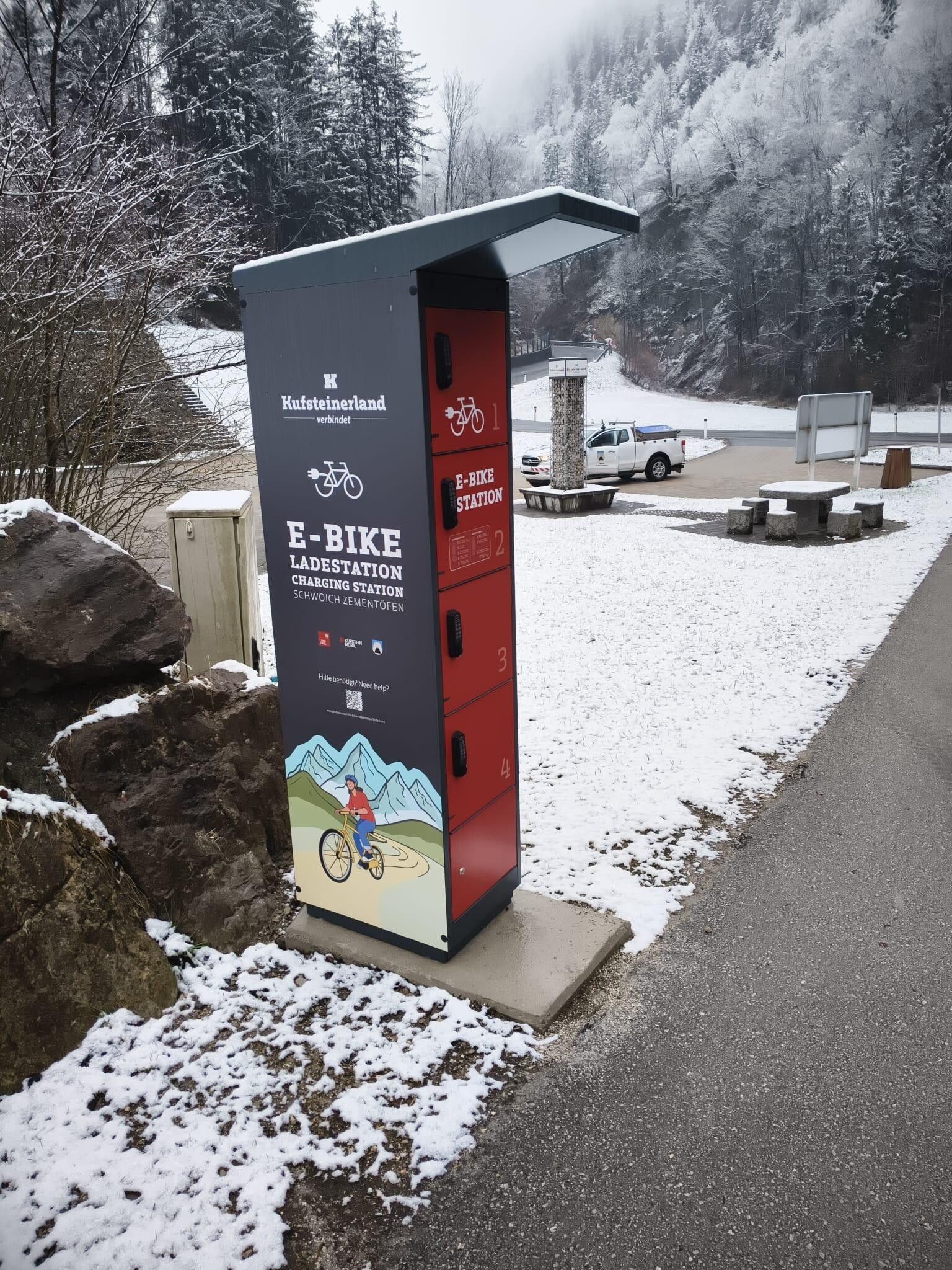 Important: No charging cable is provided – please bring your own.At this e-bike station located directly at the cement kilns in Schwoich, a relaxing break can be combined with secure storage for luggage or helmets—while the battery recharges for the next kilometers. The station includes four lockers, each equipped with two power outlets. How the locker works: To close the locker Turn the handle to the right Close the door Enter a 4-digit code (make sure to note the code so you don’t forget it!) Enter the code again Turn the handle upwards To open the locker Enter the 4-digit code Turn the handle to the right Having trouble with the locker? Help is available here. IMPORTANT NOTE The lock opens automatically after 8 hours!